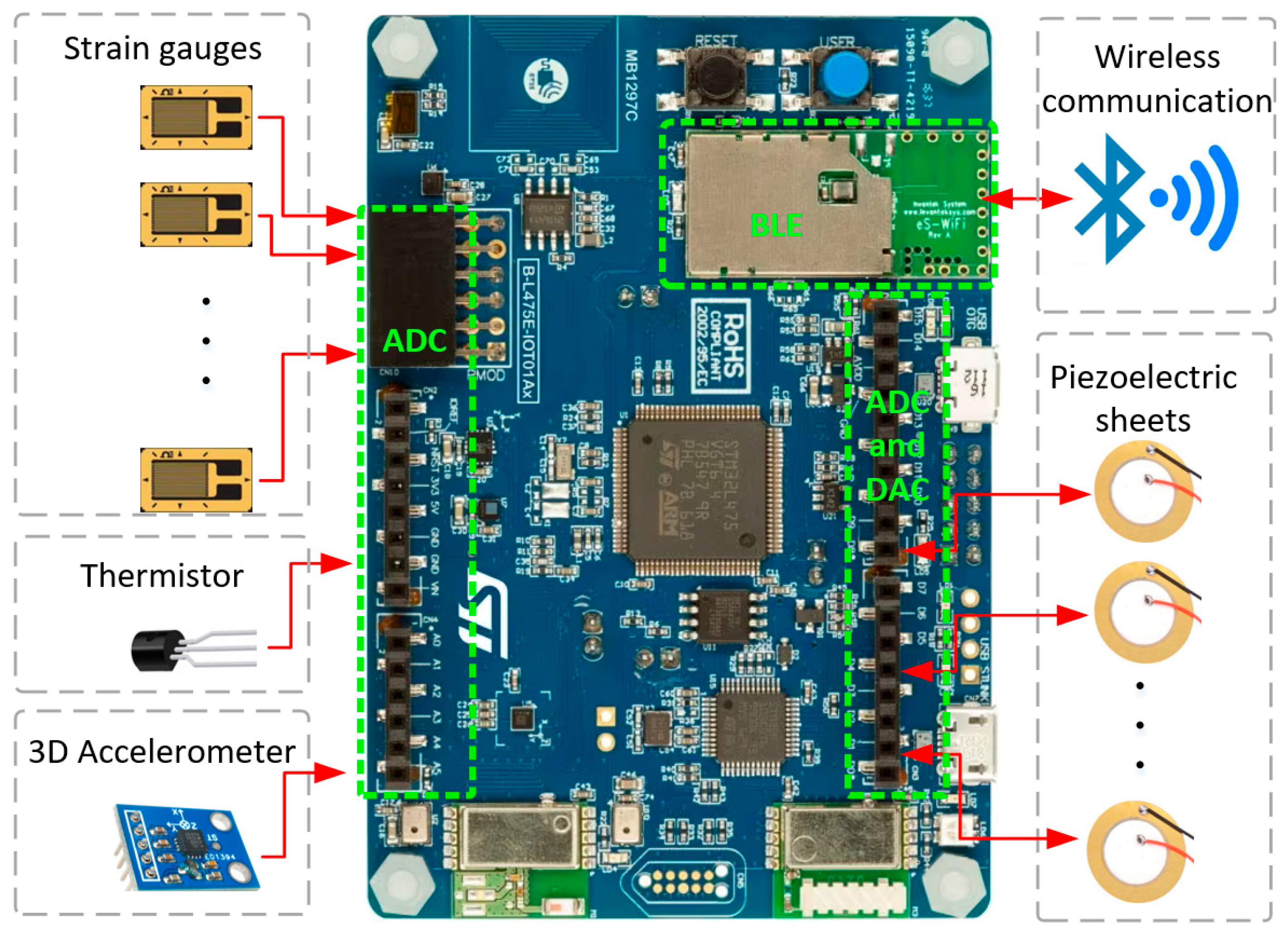 - STMicroelectronics. B-L475E-IOT01A Discovery Kit for IoT Node, Low-Power Wireless, and Sensors. B-L475E-IOT01A. Available online: https://www.st.com/en/evaluation-tools/b-l475e-iot01a.html (accessed on 29 July 2025).