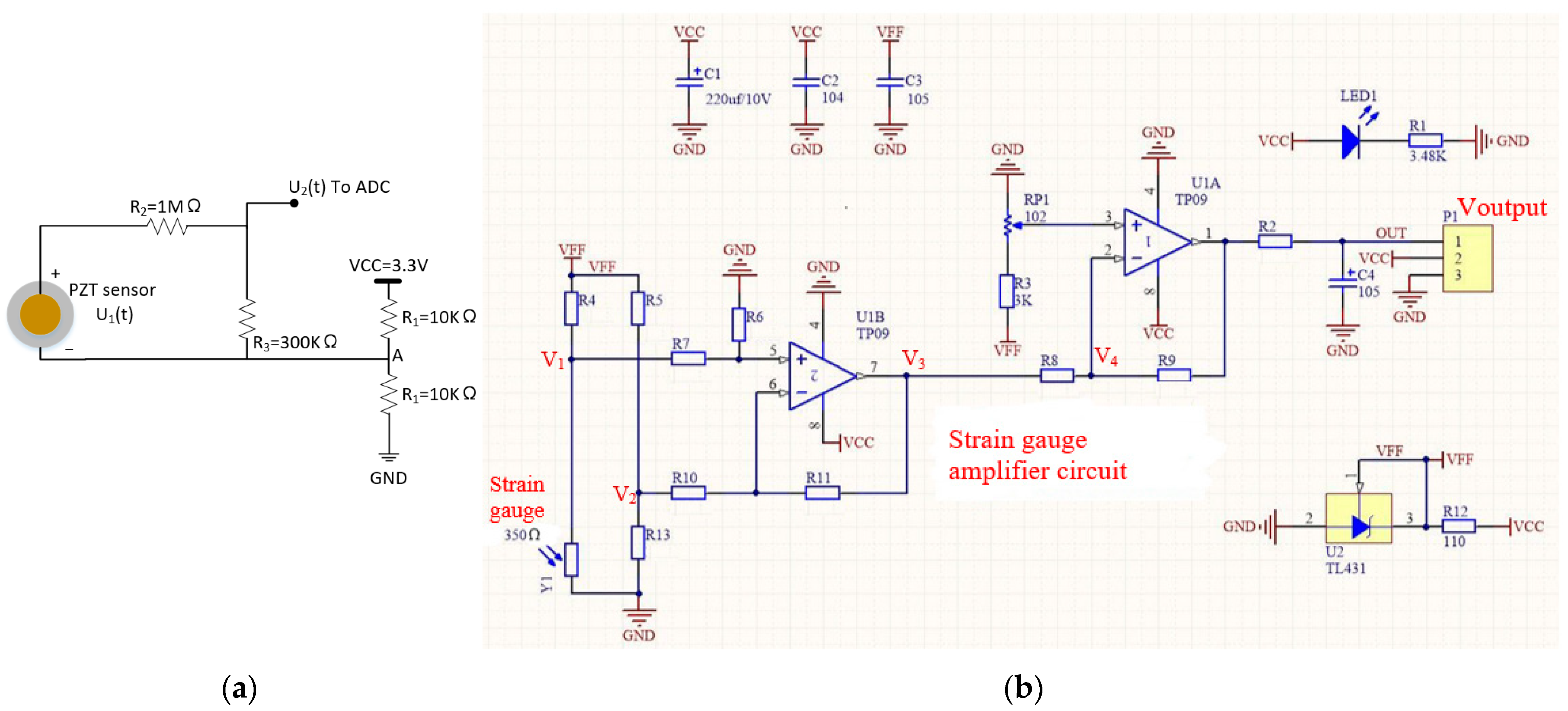 - PZT Signal Conditioning and Ongoing Improvement. In the current prototype, the PZT output (−100 V to +100 V) was scaled into the MCU’s 0–3.3 V ADC range using a high-value resistor divider for preliminary system integration. However, it inherently loads the high-impedance piezoelectric source and limits the low-frequency response. To address this limitation, a dedicated charge amplifier (transimpedance topology) is currently being designed. The new configuration provides a very high input impedance and a defined frequency response, which helps preserve the original piezoelectric signal and reduce noise. The equivalent circuit and calibration results will be included in future work.