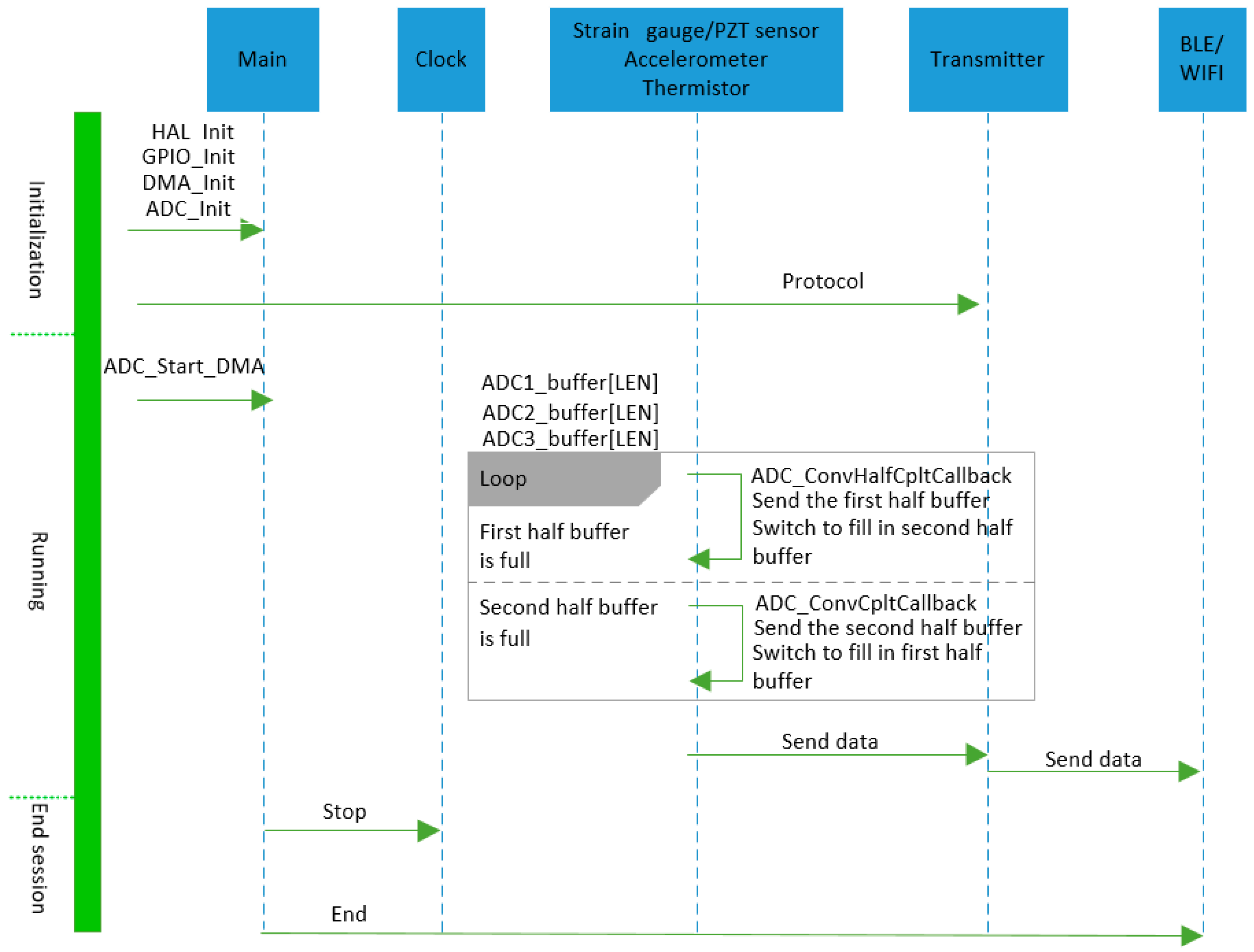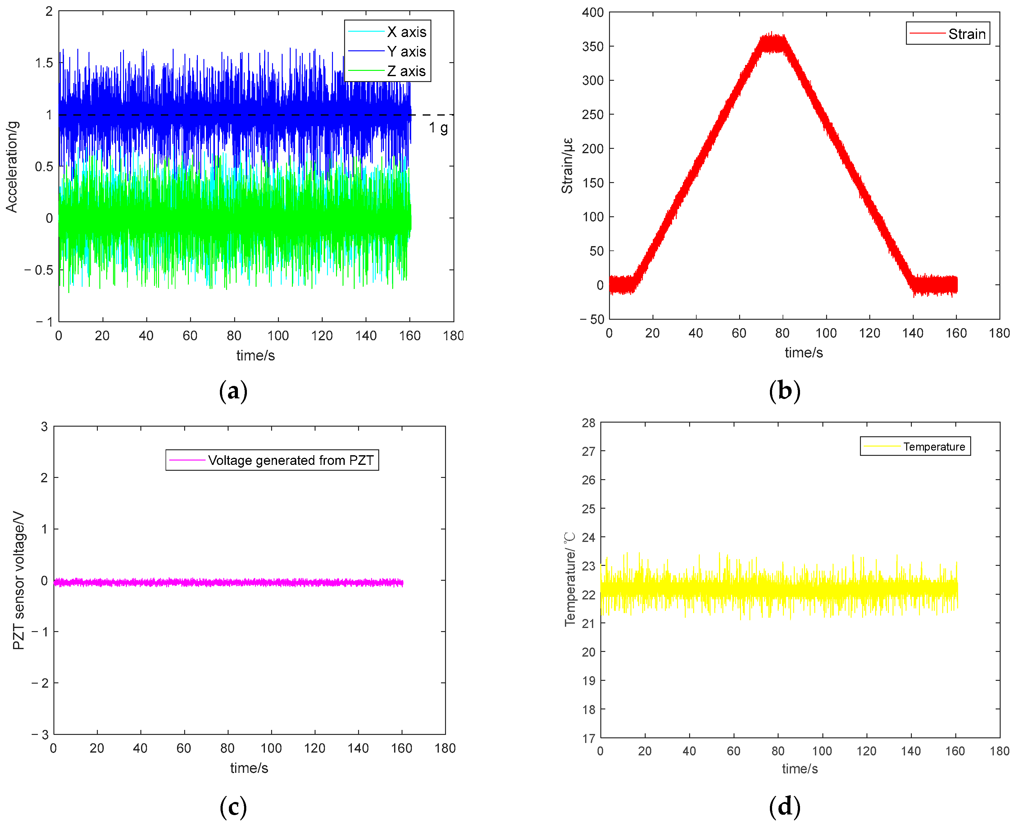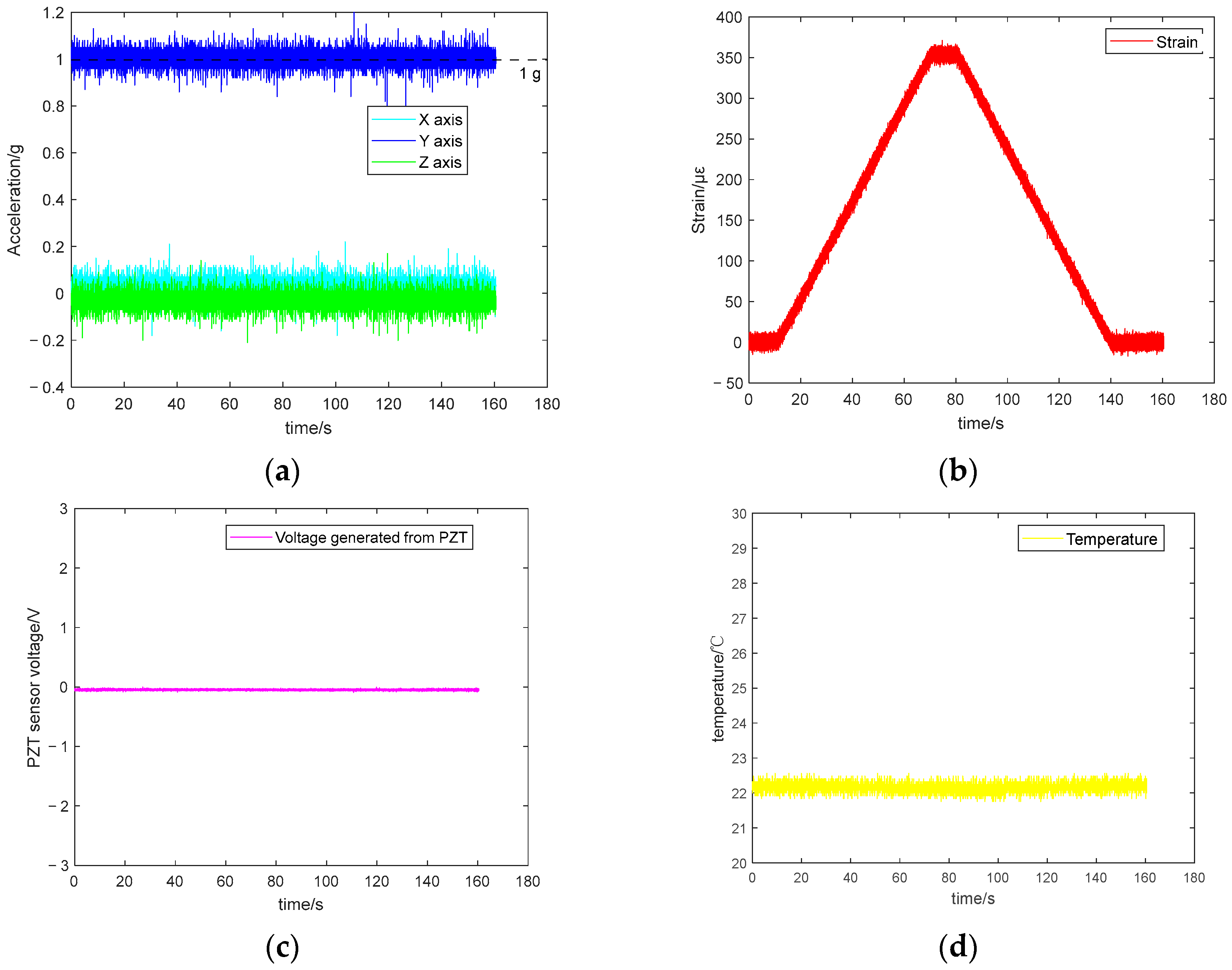 - In terms of software design, the proposed data acquisition scheme effectively enables the collection of multiple types of sensor data, including strain, acceleration, vibration, and temperature. For structural health monitoring, different sensors have different sampling frequency requirements—for example, piezoelectric and accelerometer channels require relatively high sampling rates, while temperature channels can be sampled at lower rates. Based on our current data acquisition design, optimisation is possible. The MCU used in this work provides multiple ADC modules and channels and supports DMA and timer-triggered modes. By assigning different ADC sampling frequencies to different sensors, the data acquisition can be optimised to better support structural health monitoring and remaining useful life calculations.