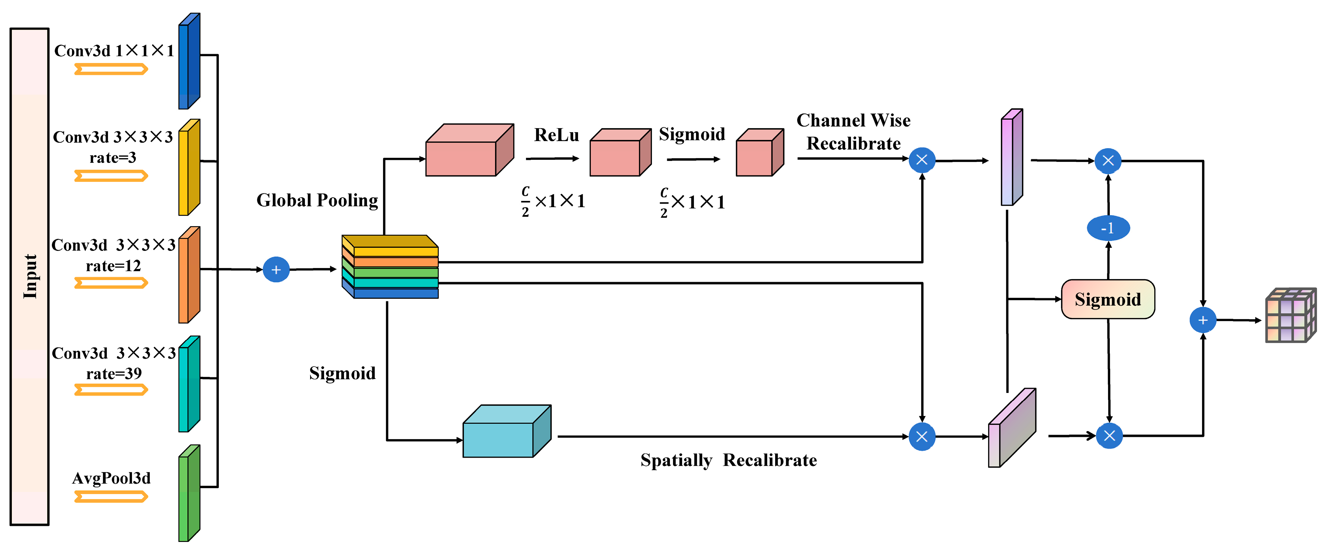 This module represents an integrated combination of multi-scale dilated convolutions with channel and spatial attention mechanisms. It performs feature extraction across multiple scales through five parallel convolutional branches, each configured with distinct dilation rates to expand the receptive field and capture spatial information at varying ranges. The first branch employs a 1 × 1 × 1 convolutional kernel to directly extract features without altering spatial resolution. The second branch uses a 3 × 3 × 3 convolutional kernel with a dilation rate of 3, moderately enlarging the receptive field. The third branch applies a 3 × 3 × 3 convolutional kernel with a dilation rate of 12, further expanding the receptive field to capture a broader range of contextual information. The fourth branch achieves the widest receptive field using a 3 × 3 × 3 convolutional kernel with a dilation rate of 39. Finally, the fifth branch incorporates a global average pooling operation to extract global contextual features, thereby enhancing the model’s comprehension of the overall scene layout.