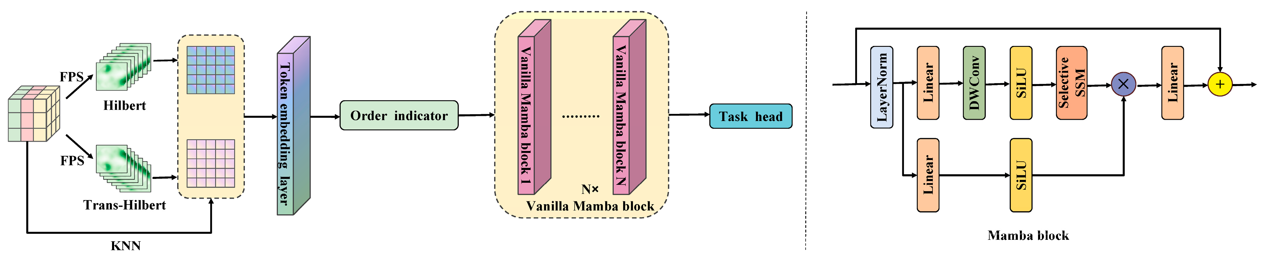 38] and Trans-Hilbert, to scan the key points, thereby preserving spatial localization effectively. Based on this, K-nearest neighbors (KNN) is applied to generate point patches, which are subsequently fed into the token embedding layer to produce serialized point tokens. To efficiently handle the inherently disordered structure of point clouds, a reordering strategy is applied to the point tokens, providing a more geometrically coherent scanning order. The reordered tokens are then input into an encoder composed of stacked Mamba modules [