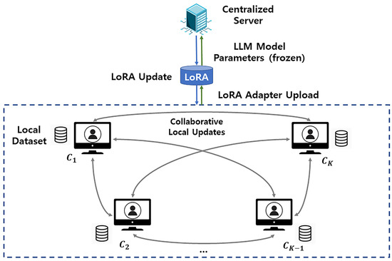 Backbone and adapters. We adopt PEFT with LoRA, keeping the pretrained LLM backbone frozen (no gradients; not transmitted) and optimizing only low-rank adapters. For a linear layer with weight W, we write with , where and , . During local training, backpropagation updates only , which substantially reduces computation and communication compared with updating the full backbone.