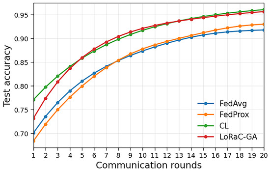 Benchmark comparison: test accuracy vs. communication rounds for FedAvg, FedProx, CL, and LoRaC-GA (ours) under a non-IID partition (Dirichlet ). FedProx uses . All methods are matched on total budget .