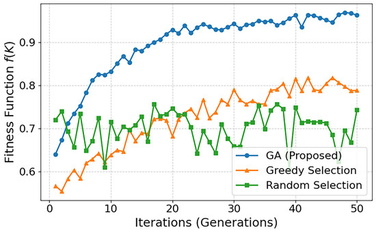 under different selection strategies. Figure 3 presents the fitness values over 50 iterations for the GA, greedy, and random selections. The proposed GA-based scheme rapidly converges to a higher fitness value (above ), demonstrating its ability to efficiently balance accuracy and communication efficiency. In contrast, greedy selection improves more slowly and saturates around , while random selection fluctuates near without a clear convergence trend. These results confirm that GA not only finds superior tradeoffs but also achieves them with faster and more stable convergence compared to baseline strategies.