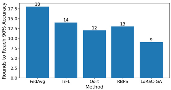 Figure 5 compares the number of rounds required by different methods to reach target accuracy. LoRaC-GA achieves convergence in only 9 rounds, which is substantially fewer than those of FedAvg (18 rounds), TiFL (14 rounds), Oort (12 rounds), and RBPS (13 rounds). This result demonstrates that by jointly optimizing the number of participating clients under a bandwidth budget, LoRaC-GA not only reduces the communication overhead but also accelerates the convergence speed. The performance gap confirms that the proposed GA-based selection is more effective than existing client selection and PEFT approaches, highlighting its suitability for bandwidth-constrained LLM adaptation.