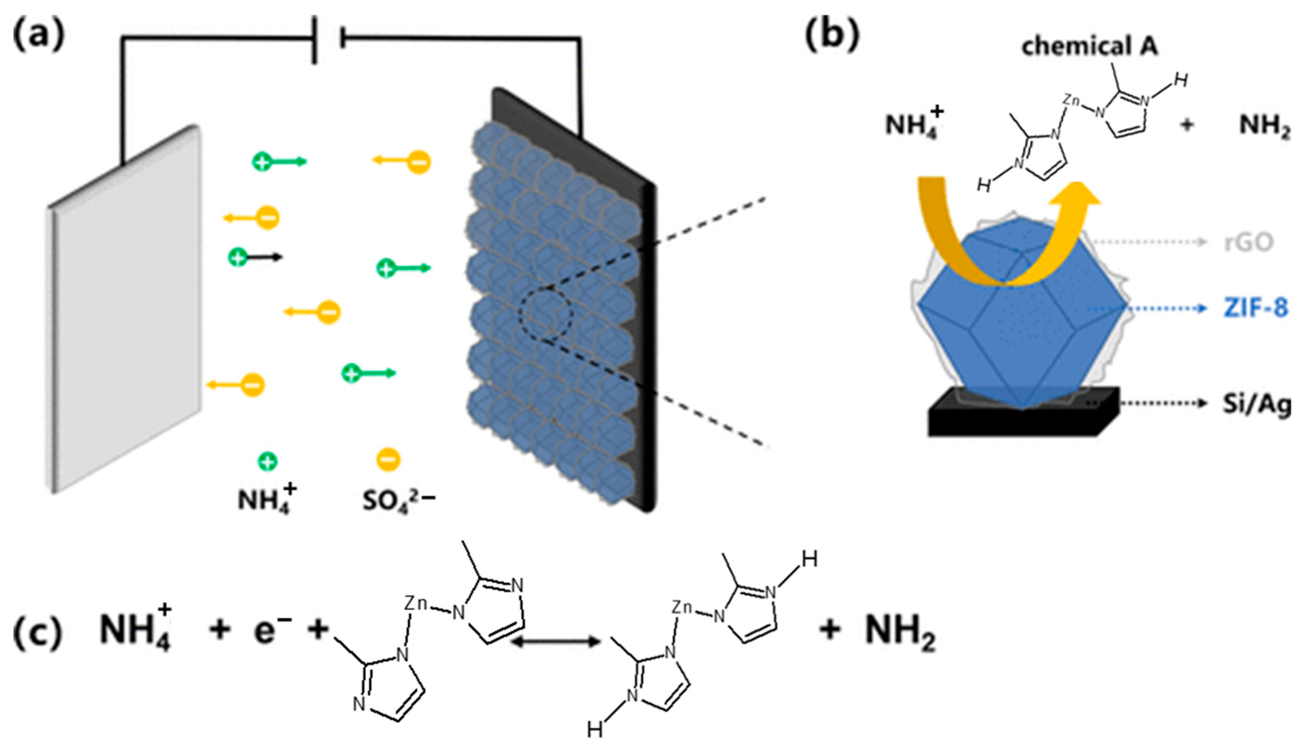 - Zeng, W.; Luo, S.; Rong, D.; Li, Y.; Fei, Y.; Zhao, M.; Huang, L. The NH4+ Electrochemical Sensor with the 3D-2D Electron Transfer Channel Based on ZIF-8/rGO Composite Frameworks. J. Phys. Chem. C 2025, 129, 1138–1148. [Google Scholar] [CrossRef]