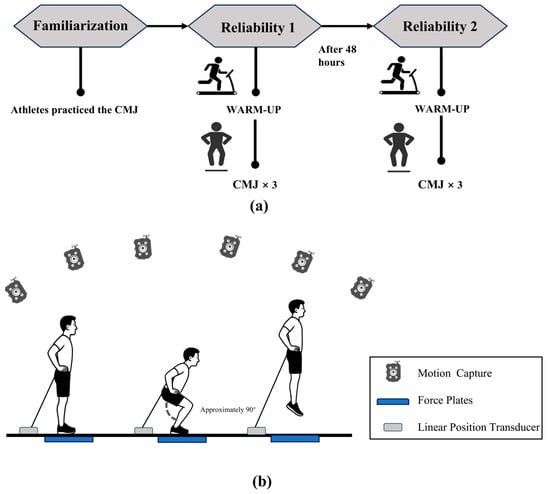 The experiment was conducted in the Biomechanics Laboratory of Shaanxi Normal University. All athletes completed one familiarisation session before the experiment. Before the experiment began, the players warmed up with 5 min of jogging and 10 sub-maximal jumps. A 10-camera infrared motion capture system (Oqus700+, Qualisys AB, Gothenburg, Sweden) was employed to record kinematic data at a sampling frequency of 200 Hz. The Qualisys motion-capture system was calibrated at the start of each session using the vendor L-frame to define the global coordinate system and a dynamic wand procedure; the final volume calibration residual was ≤0.5 mm. Kinetic data were collected using two force plates (Kistler 9260AA6, 0.5 m × 0.6 m; Kistler Instruments Corp., Winterthur, Switzerland) with a sampling frequency of 1000 Hz. Kistler force plates were zeroed and checked with certified 5 kg masses placed centrally; measured vertical forces matched the expected loads after gravity correction. Motion capture data were collected synchronously with ground reaction force data (Qualisys Track Manager, Qualisys). The motion capture and force plates were hardware-synchronized within the Qualisys acquisition environment via BNC cabling and a common TTL trigger. Participants wore uniforms and tight pants, were given a pair of shoes, and used 61 reflective markers placed on bony landmarks. The sticking model referred to the modified Helen Hayes model [28,29] (Appendix A). At the same time, participants were attached to the LPT (GymAware, Kinetic Performance Technology, Canberra, Australia) via a waist belt. This configuration approximates the waist-point (pelvic) method, using belt/pelvis motion as a surrogate for the whole-body center of mass. Previous studies have shown that pelvis-based kinematics can approximate COM motion during jumping tasks within acceptable error bounds [30,31]. The LPT was wirelessly connected to an iPad running the proprietary GymAware software (v2.4.1). To minimise systematic measurement error, the position of the LPT transducer was standardised across all participants and testing sessions [13]. Before each measurement, the tether was fully retracted, and the device was “zeroed” using the software’s calibration function to establish a consistent zero baseline. The GymAware LPT employs an adaptive sampling rate (50 Hz) and digitally filters the raw signal to minimise noise. Subsequently, the processed tether length data is converted into vertical displacement by applying trigonometric corrections that account for any horizontal movement of the tether [32].
