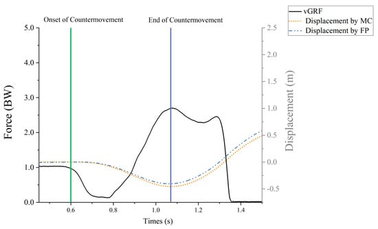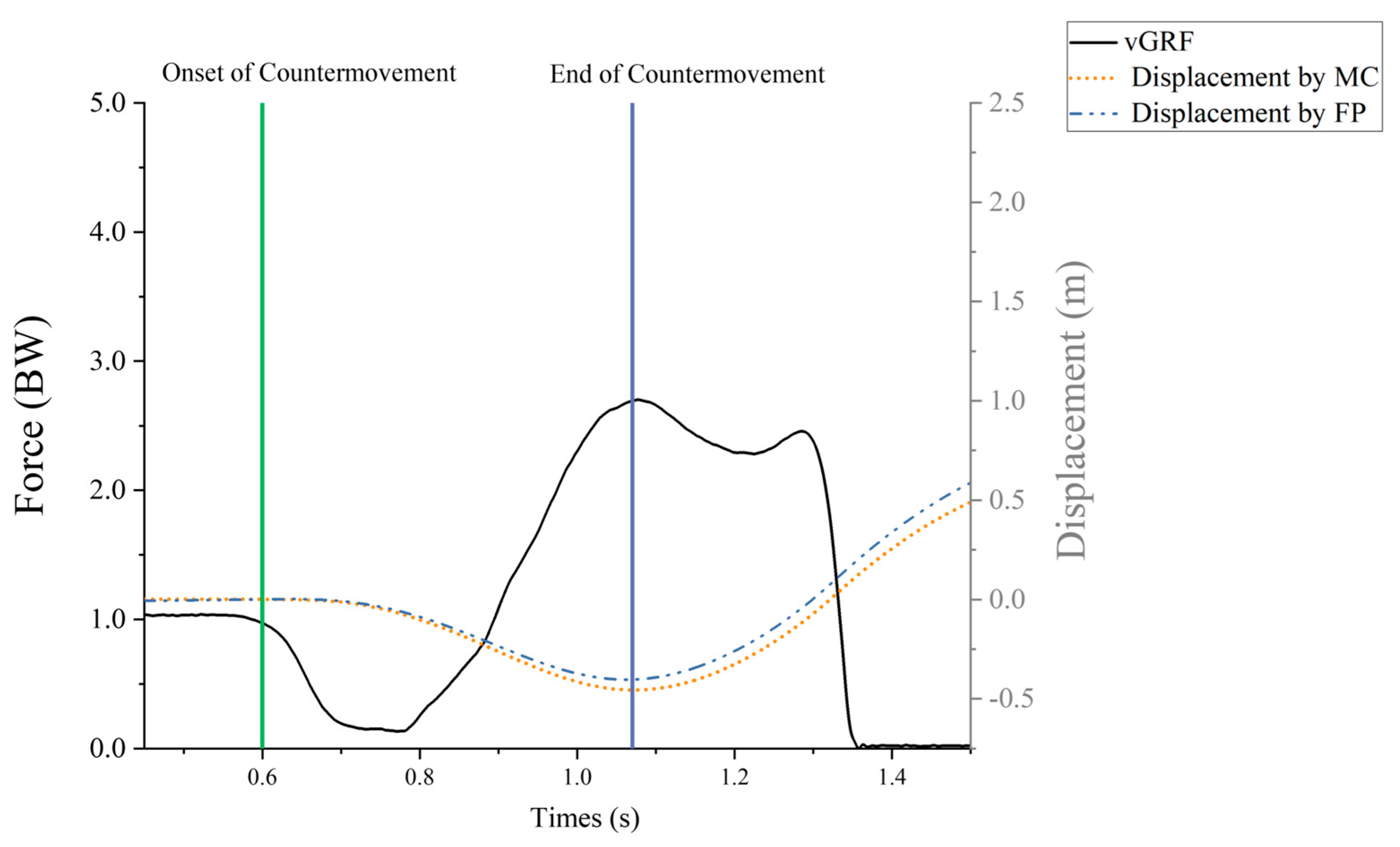 The COM variables were used in the rigid body kinematic model to compute the whole-body relative to the laboratory coordinate system. Start and end events were created in V3D with the threshold set to 20 N [36]. The start event is when the vertical ground reaction force (vGRF) drops below one’s body weight minus 20 N, and the end event is when the vGRF falls below 20 N. Find the moment of the lowest vertical displacement of COM within the start and end event times, from the beginning of the action to the lowest vertical displacement as time to the lowest COM. The change in COM minimum displacement and the time to lowest COM required determined MC’s countermovement depth and velocity. The kinetics data were exported into MATLAB R2023b (MathWorks), and the vertical combined forces from the two force plates were used in a custom script to calculate COM vertical displacements based on the double integrals (DI) of acceleration (net force divided by body mass). After filtering, the net vertical force data were double integrated to calculate the vertical displacement of the center of mass (COM). To reduce integration drift, we applied start constraints at movement onset—defined as the instant when the vertical ground reaction force fell below body weight minus 20 N—and set both the COM velocity and displacement to zero at that time. In this formulation, Equation (1), t0 represents the start time of the movement. The net force Fnet(τ) is the difference between the measured vertical ground reaction force FvGRF(τ) and the product of body mass m and gravitational acceleration g. The variable τ serves as the variable of integration throughout the calculation process. Figure 2 provides a visual representation of the CMJ with the associated phases of the force-time curve. Additionally, countermovement velocity was calculated as the change in COM vertical position from movement onset (t0) to the end of the countermovement (minimum COM), divided by the elapsed time (t minus t0). Values of CMD were reported as positive magnitudes.
