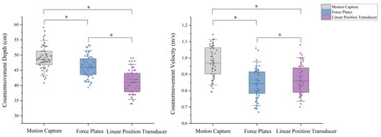 Countermovement depth, countermovement velocities (M ± SD) in the CMJ test per measuring tool. Note: * Indicates statistically significant difference, p < 0.05.