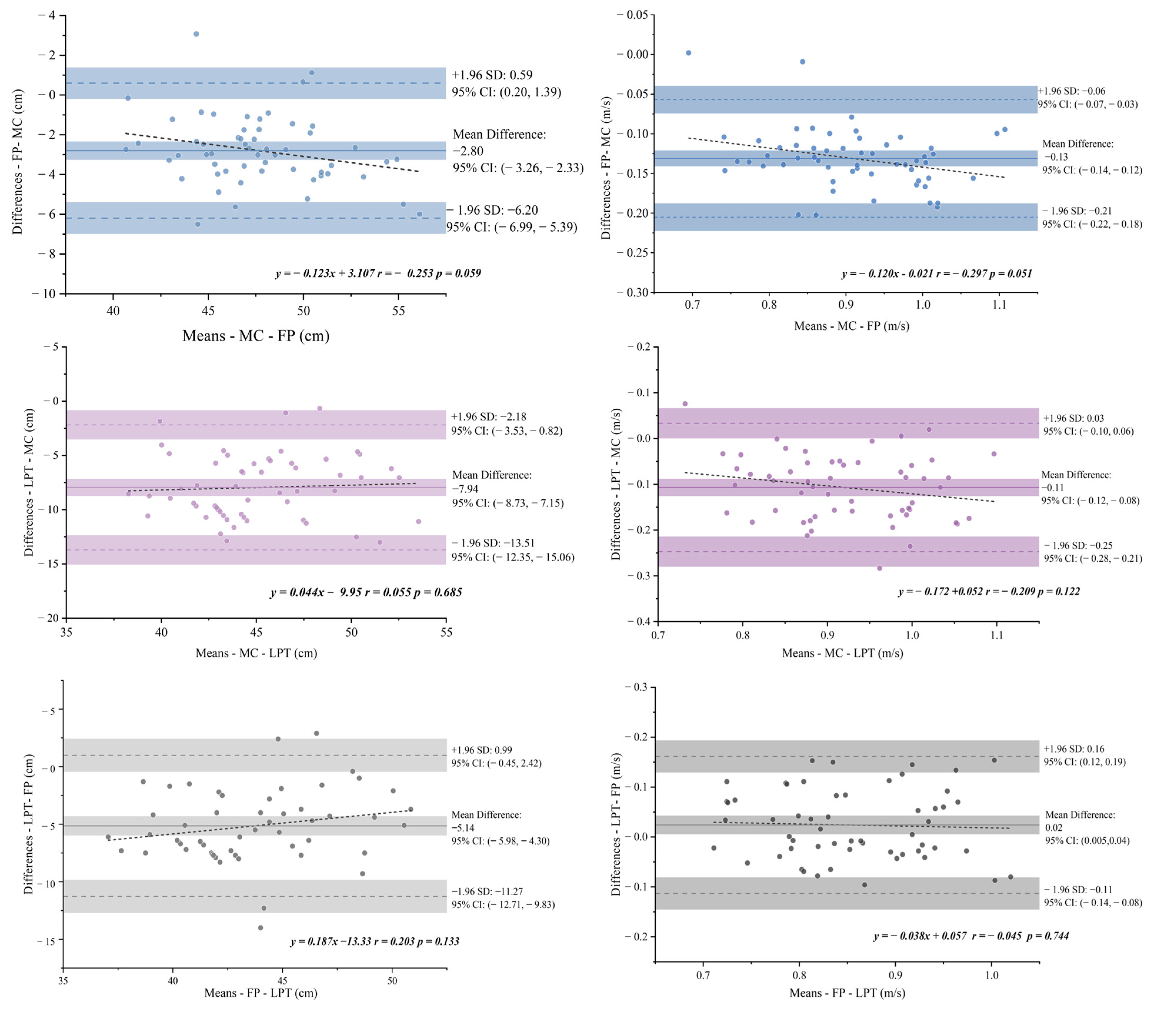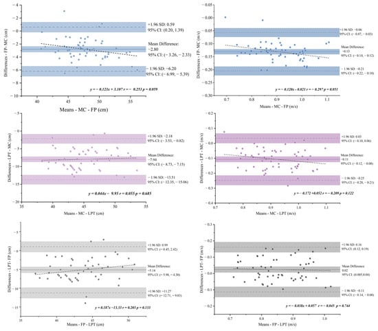 Comparison of different devices was achieved using Pearson product-moment correlation analysis (r). The motion capture system is the “gold standard”, so the MC variable is the dependent variable. While correlation analyses show how two variables are related, they do not necessarily reveal how much the values agree or disagree. Therefore, the Bland–Altman plots and 95% limits of agreement (LoA) were used to demonstrate the bias between the MC, the FP, and LPT to show the agreement levels. The magnitude of correlation between the LPT and the MC, the FP and the MC was assessed using the following thresholds: between 0.5 and 0.69 was considered moderate, between 0.70 and 0.89 was considered high, and over 0.9 was considered very high [26]. Additionally, we computed derived absolute and squared errors for FP and LPT. The mean absolute error (MAE) was the mean of the absolute differences; the root-mean-square error (RMSE) was the square root of the mean of the squared differences. Normalized RMSE (NRMSE, %) was defined as NRMSE = 100 × RMSE / mean (MC), reported separately for CMD and CMV.