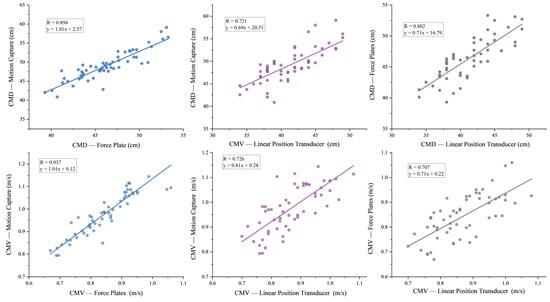 Relationship between the motion capture and linear position transducer, and between the motion capture and force plates-derived CMD and CMV. Note: CMD: countermovement depth. CMV: countermovement velocity.