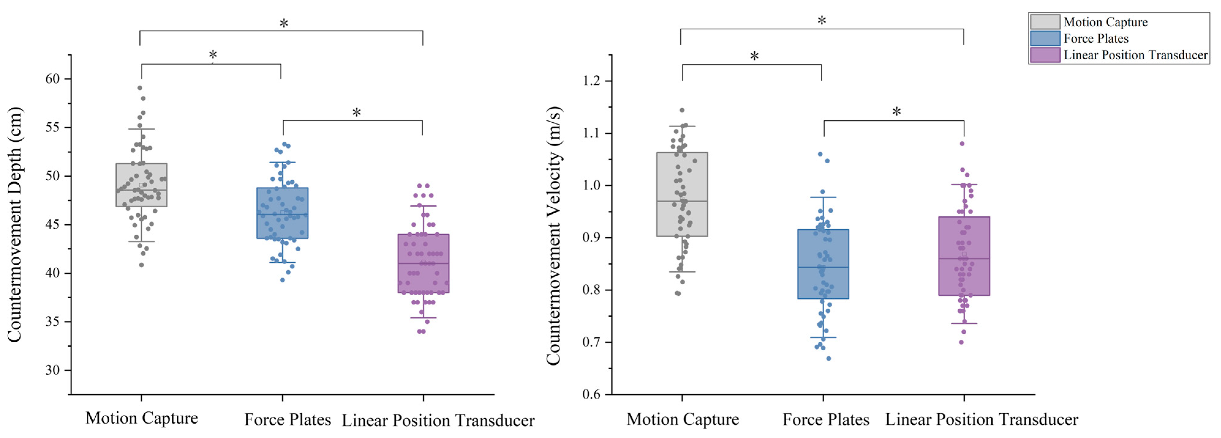 Therefore, this study aimed to determine the concurrent validity of depth and velocity of countermovement measured by the force plates (FP) and the linear position transducer (LPT) by comparing with motion capture (MC). Meanwhile, the reliability of depth and velocity of countermovement, calculated based on FP and LPT, was determined by inter-day retesting. The first hypothesis of this study was that force plates (FP) would demonstrate excellent validity for measuring countermovement depth (CMD) and velocity (CMV), showing strong agreement with the motion capture (MC). In contrast, the linear position transducer (LPT) was hypothesised to exhibit an overestimation of CMD and CMV compared to other devices. The second hypothesis was that both the FP and the LPT would demonstrate good to excellent between-day reliability in their measurements of CMD and CMV.