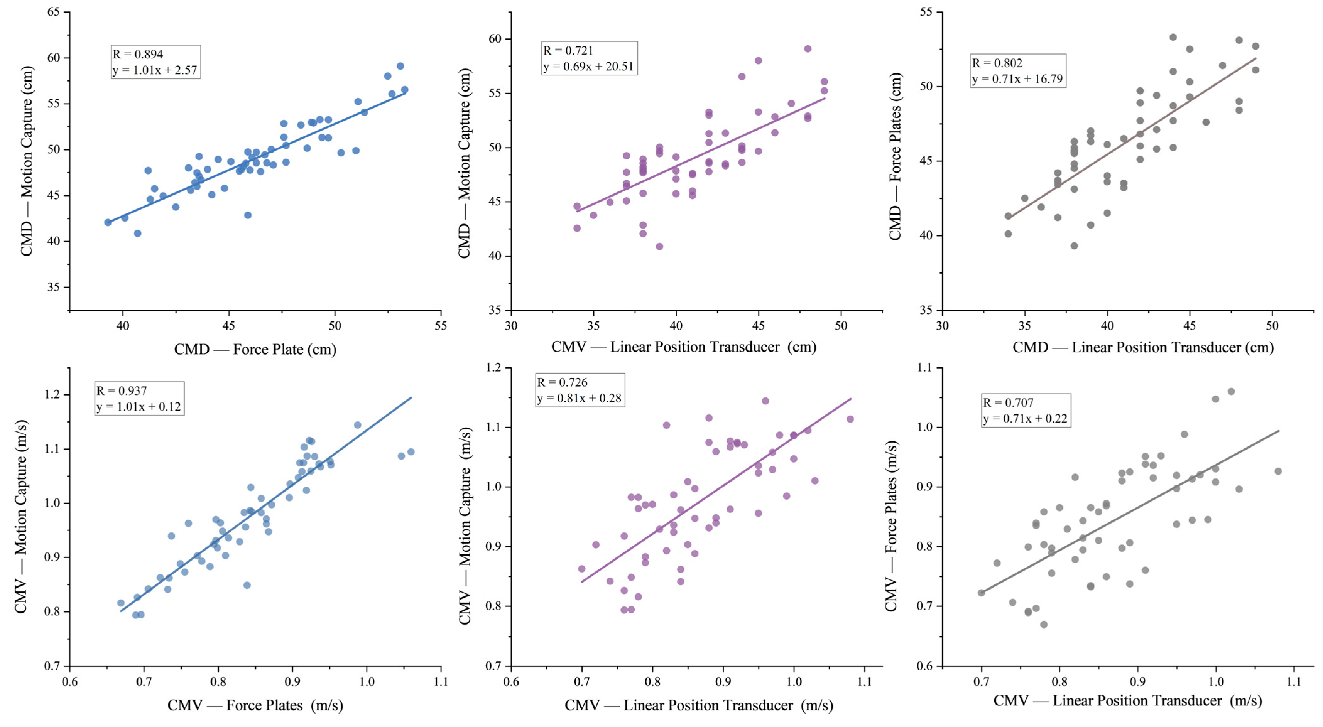 Figure 5. Relationship between the motion capture and linear position transducer, and between the motion capture and force plates-derived CMD and CMV. Note: CMD: countermovement depth. CMV: countermovement velocity.