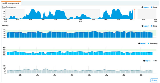 The Nedap CowControl® system (Nedap Livestock Management, Groenlo, The Netherlands) was employed, utilizing SmartTag intelligent collars (codes FERP4, 3rd generation). Each SmartTag incorporates a triaxial accelerometer that transmits data at 434 MHz with a power of <1 mW e.r.p., features an IP67 protection rating, and has an operational temperature range from −10 °C to 50 °C. The battery-powered (3V DC) RFID transmitters continuously record feeding, rumination, resting, locomotion, and inactivity, storing data locally for 24 h before transmission to the CowControl antenna (outdoor range ≥ 100 m). Data were processed by specialized algorithms on the cloud-based platform to detect reproductive, health, and behavioral patterns, generating automated alerts and analyses for both individual animals and the herd [14]. These data were used to derive day/night activity indices and 24- to 36 h time series for circadian analysis, as detailed in Section 2.3, Section 2.4 and Section 2.5 (Figure 1 and Table 1).