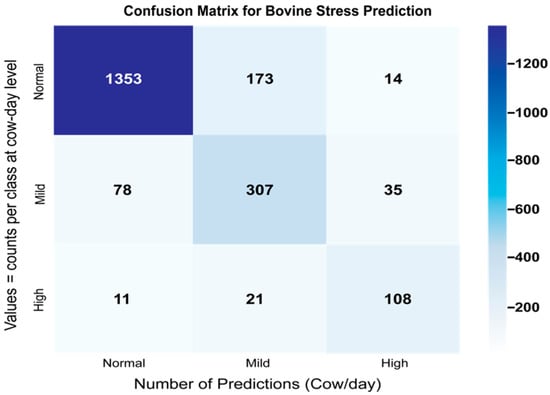 A window was labeled as mild/high stress when (i) exceeded the corresponding threshold and, additionally, at least one of the following conditions was met within a temporal tolerance (e.g., ±1 h): (a) A veterinary annotation of anomalous behavior. (b) The THI was used as a contextual rule within the operational labeling (see Appendix C). Therefore, analyses based on the THI cannot be considered independent validation. (c) A circadian deviation from the expected pattern (phase shift and/or amplitude drop). When no additional condition was met, the window remained classified as normal (see Table 2).