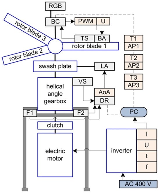 General scheme of the test stand, BC—blade controller, RGB—color signaling of status, TS—temperature sensor, BA—blade actuator, LA—linear actuator, VS—three axis vibration sensor, DR—data recorder, F1, F2—tensometer, T1–T3—temperature in blade, AP1–AP3—actuator position, AoA—angle of attack, PWM—actuator power signal filling, U—voltage, I—current, t—time, f—frequency. The arrows indicate the directions of the signal and the electric supply.