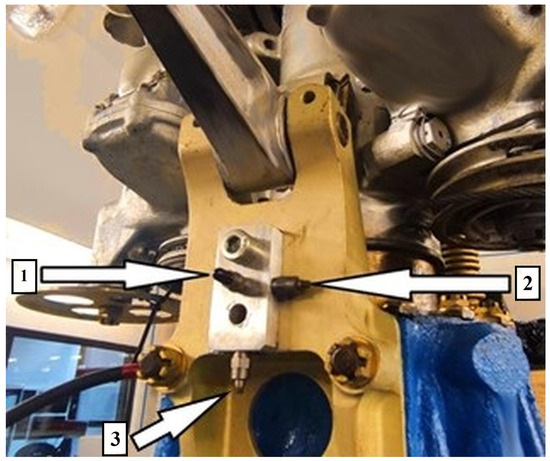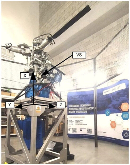 Figure 2 indicates that the test stand enables vibration measurements in the X, Y, and Z axes. These axes were selected due to the lift force acting along the X-axis, while most rotating components move in the Y–Z plane. The stand is equipped with a specialized system for recording vibration waveforms. Vibration sensors were mounted at the top of the main gearbox housing and shown on Figure 3.