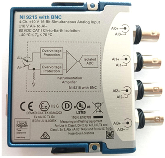 - Signal acquisition was performed using the NI-9215 C-Series (National Instruments, Austin, TX, USA) analog input module (Figure 4), equipped with four simultaneously sampled differential input channels.
