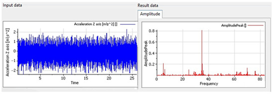 The data underwent preliminary preprocessing before being imported into the NI DIAdem environment (Figure 5). Spectral analysis was performed using Fast Fourier Transform (FFT), which made it possible to obtain vibration spectra characteristic of the tested stand [34].