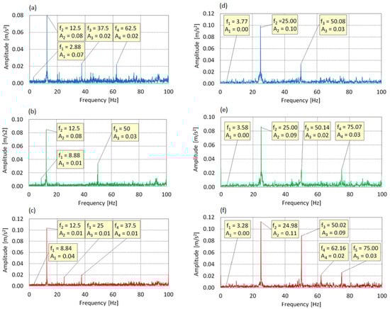 In the spectrum shown in Figure 6, four dominant components were identified: f1 = 2.88 Hz, f2 = 12.5 Hz, f3 = 37.5 Hz, and f4 = 62.5 Hz. The frequency f1 corresponds to the actual rotational speed of the main rotor, resulting from gear reduction (f0 = 25 Hz) with a ratio of 8.68:1. The highest amplitude (0.08 m/s2) occurred at f2 = 12.5 Hz, which is a subharmonic (0.5× f0). The presence of components f3 and f4, corresponding to 1.5× and 2.5× f0, indicates that the vibration spectra exhibit a rich frequency content with multiple harmonic and sub-harmonic components, reflecting the multi-source excitation of the test stand. The absence of a peak at f0 = 25 Hz suggests selective damping of the fundamental excitation and dominance of subharmonic resonance.