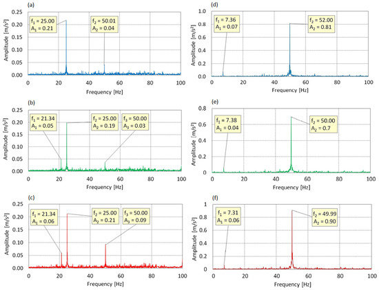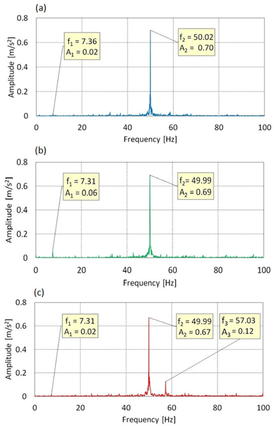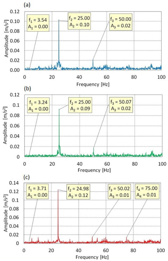Figure 7 presents the vibration spectra along the Z-axis. Three dominant components were identified: f1 = 3.54 Hz, f2 = 25.00 Hz, and f3 = 50.00 Hz. Component f1, associated with rotor rotation, showed minimal amplitude and did not significantly influence the dynamic response. The dominant component was f2 = 25 Hz (f0) with a maximum amplitude of 0.10 m/s2, while f3 = 2 × f0 had a much lower amplitude (0.02 m/s2), suggesting weak nonlinearities or asymmetric loads.