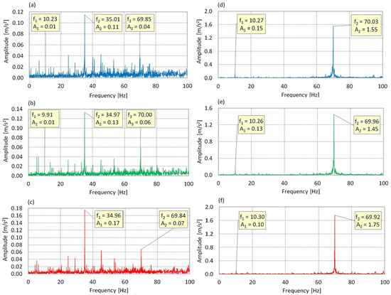 Vibration spectrum for the f0 = 70 Hz: (a) AoA = 0°, X-axis; (b) AoA = 8°, X-axis; (c) AoA = 16°, X-axis; (d) AoA = 0°, Y-axis; (e) AoA = 8°, Y-axis; (f) AoA = 16°, Y-axis.