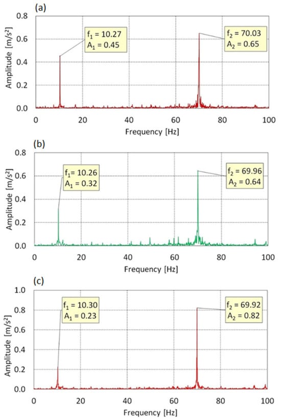 Vibration spectrum for the f0 = 70 Hz in Z-axis: (a) AoA = 0°, (b) AoA = 8°, (c) AoA = 16°.