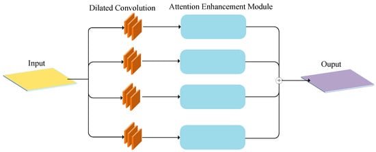 X is the original input, and and are the outputs of channel and spatial attention. Combining them helps the network focus on important features in both channel and spatial dimensions, improving feature representation and model performance. To better handle occluded targets, we improved the model into the Attention Guided Scale Adaptation (AGSA) module with four parallel channels. Each channel has an expansion convolution (rates 1–4), followed by an attention enhancement module. These parallel pathways allow the model to capture multi-scale contextual information more effectively, improving feature selection. The attention enhancement module further refines the feature selection by suppressing irrelevant features and enhancing key ones, making the model more robust to scale variations and occlusions in the target features. The outputs are then summed element-wise for the final attention regression, enabling more robust handling of scale variations and occlusions in the target features, as shown in Figure 4.