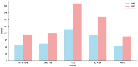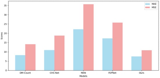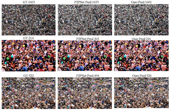 In the data preprocessing, each crowd image is normalized and standardized, which can effectively improve the convergence speed of the model. Then, the scaling factor is randomly selected from [0.7, 1.3] for each image to scale to ensure that its short edge is not less than 128. Finally, small images with a fixed size of 128 × 128 are randomly cropped from the original image, and each cropped image is randomly flipped with a 50% probability. In the training phase, we use the Adam algorithm with a fixed learning rate of to optimize the model parameters, and set the training batch size to 8. The parameter k for the truth value attention map is set to 8, and the number of candidate points M is set to 1024 to ensure that it is greater than the number of truth points contained in all cropped pictures. At the same time, in Experiment 1, we compared the training of PartA and PartB of ShanghaiTech. In Experiment 2, we compared the fusion trainings of PartA and PartB of ShanghaiTech. In Experiment 3, we predicted PartB with the pretraining model on PartA and cross-verified PartA and PartB with the pretraining model of fusion training.