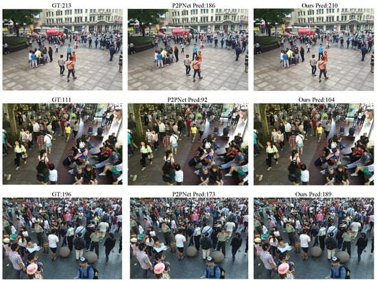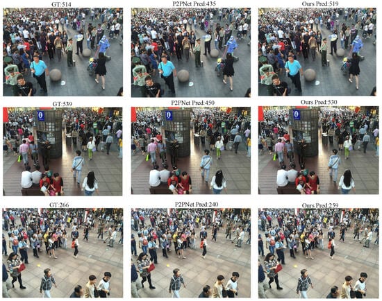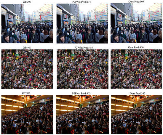 Visual comparison between P2PNet and our model in cross-validation of ShanghaiTech A to B.