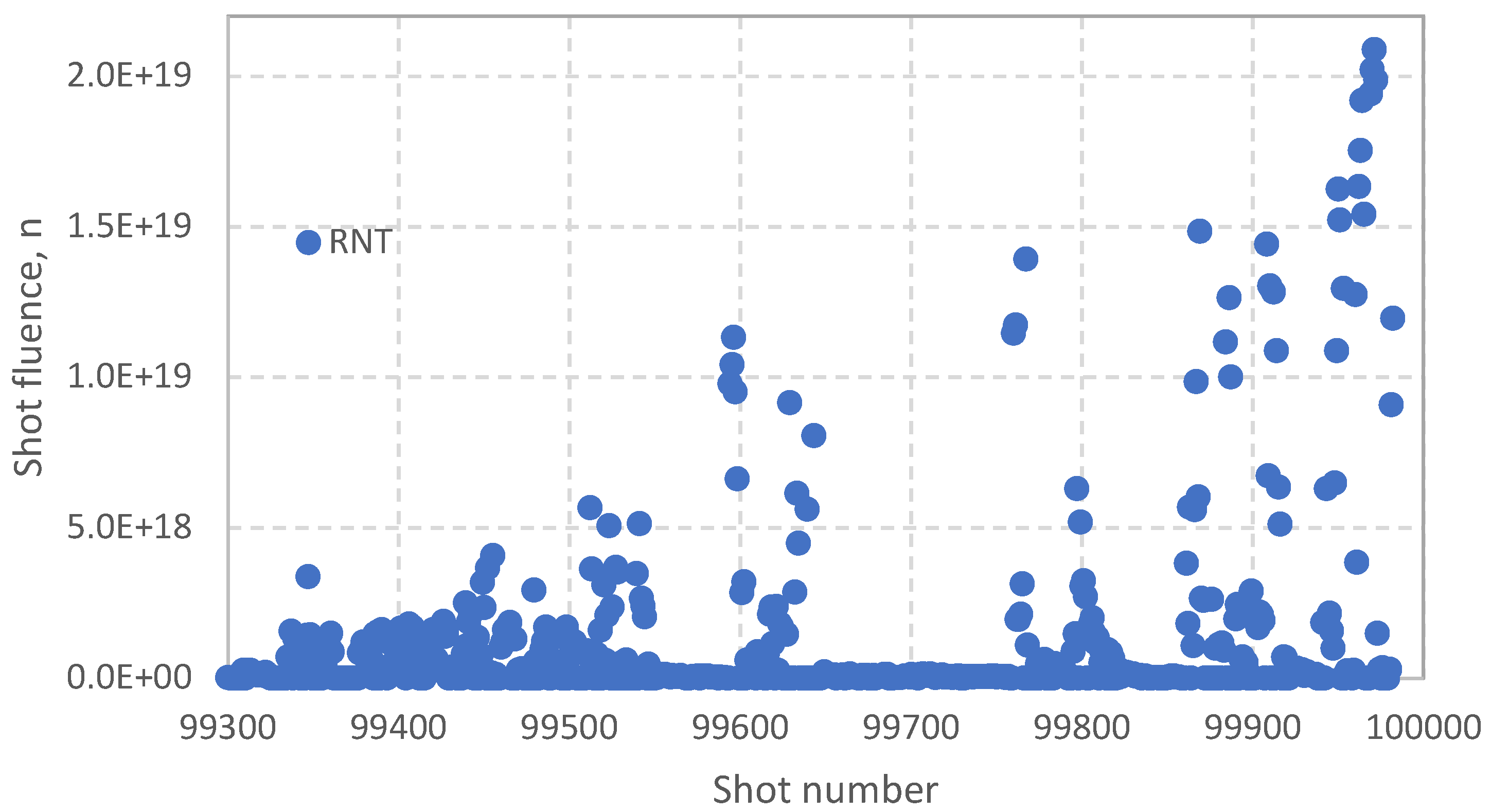 The start of the DTE2 campaign was on 13 August 2021, shot #99330. It corresponds to an increase in the neuron production in Figure 3. During high power D-T shots the U235 signals saturate and the signal processing switches to the U238 Fission Chambers, seamlessly merging intershot with carefully calibrated transitions. A total D-T neutron fluence for the DTE2 was 8.5 × 1020 n. The JET safety case defined 2 × 1021 n limit on the 14 MeV neutron fluence on the VV over the JET lifetime.