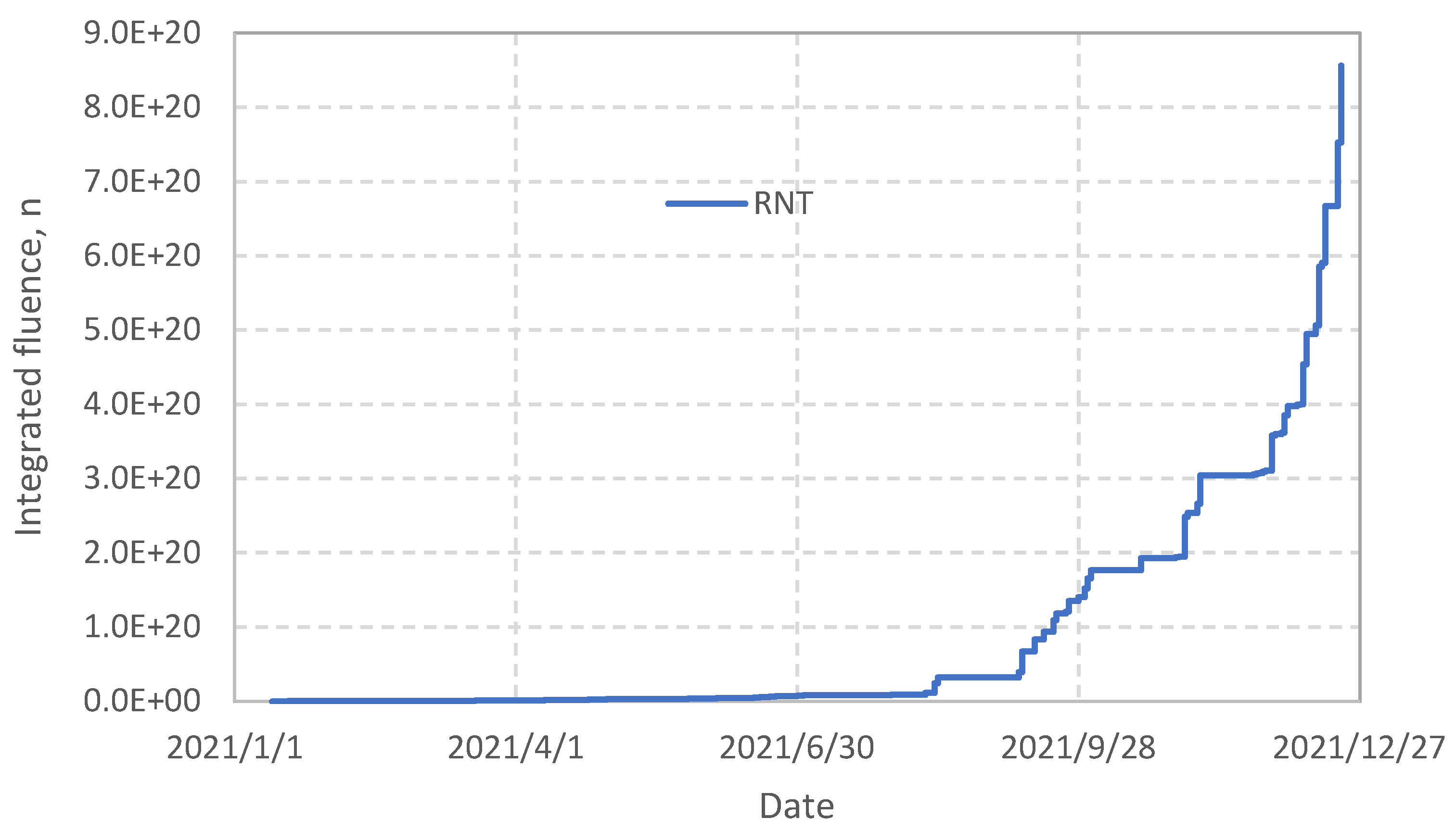 - Žohar, A.; Lengar, I.; Conroy, S.; Snoj, L. D022—Detailed Calculation of n-Flux and Spectrum at Actual Experimental Positions for the Actual Irradiation History in TT Campaign (Including FOCS); CCFE: Culham, UK, 2020; p. 16. [Google Scholar]