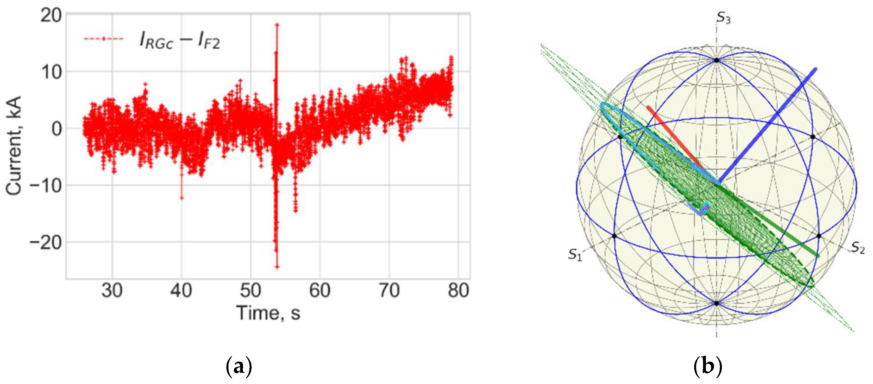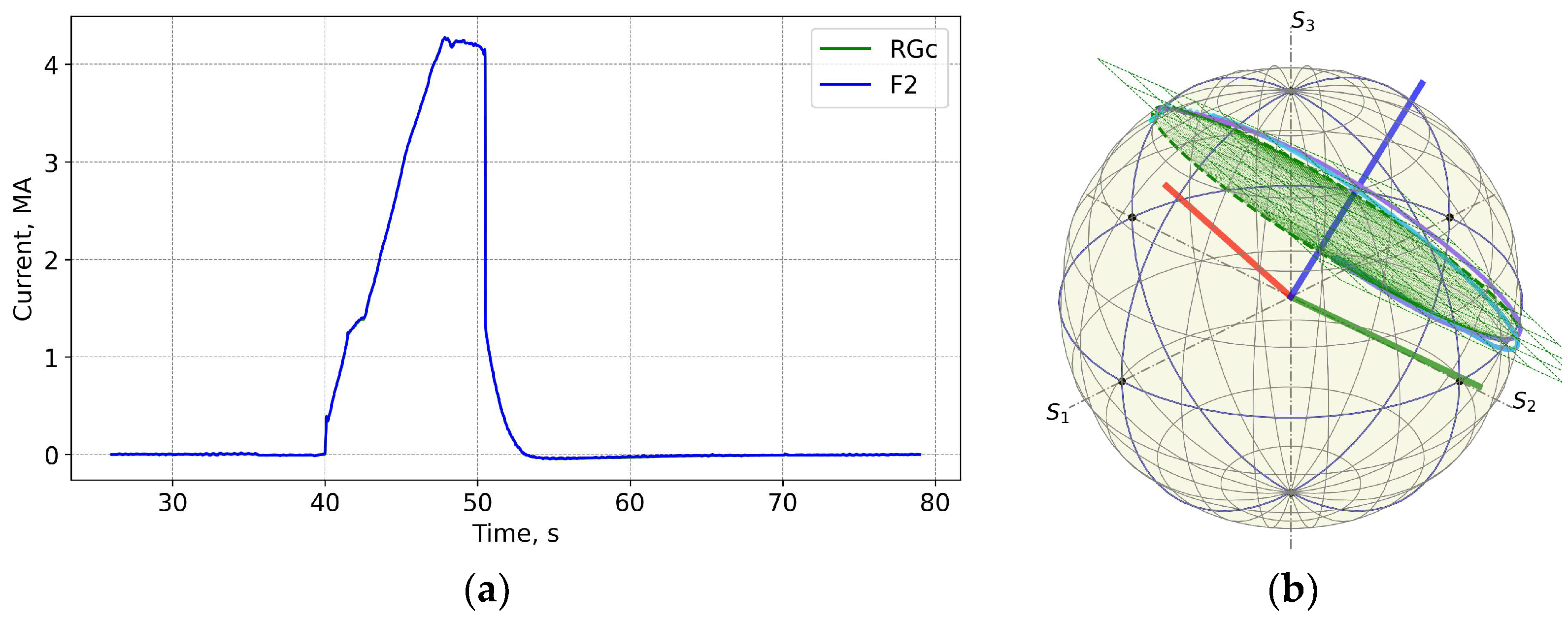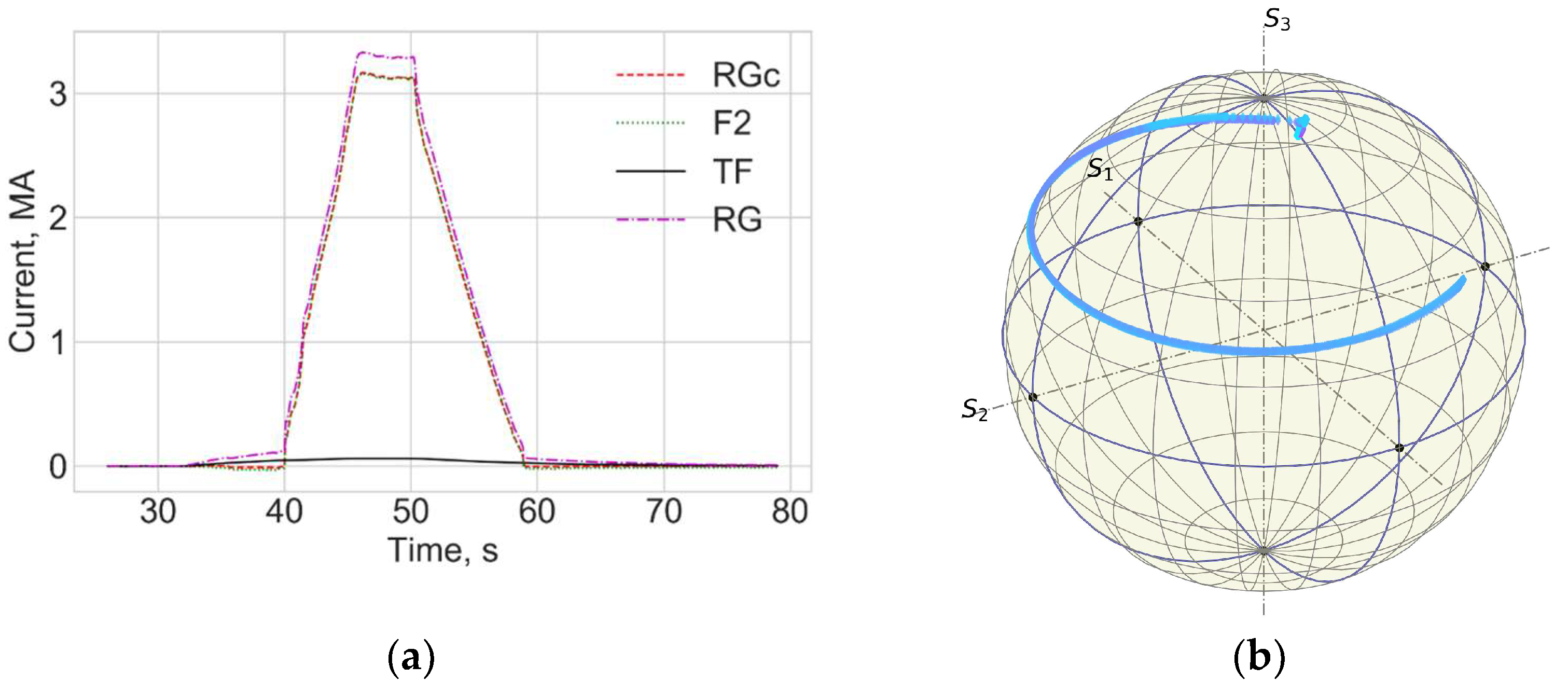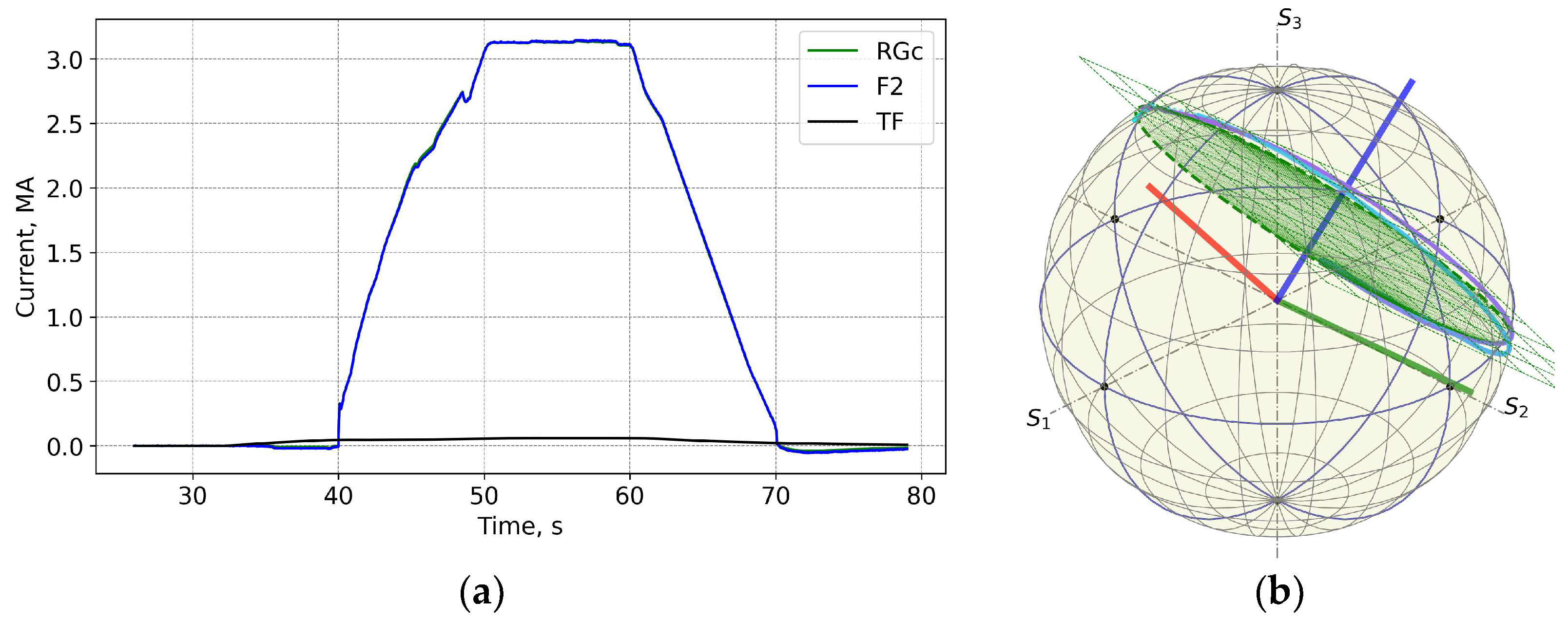 JET Shot 98655. Current profiles (a) and the FOCS data the trace on the rotated PS (b). RG—CER data, RGc—corrected CER data; TF—TF coil current; F2—FOCS-2 measurements. S1, S2, S3 are the components of the Stokes vector.