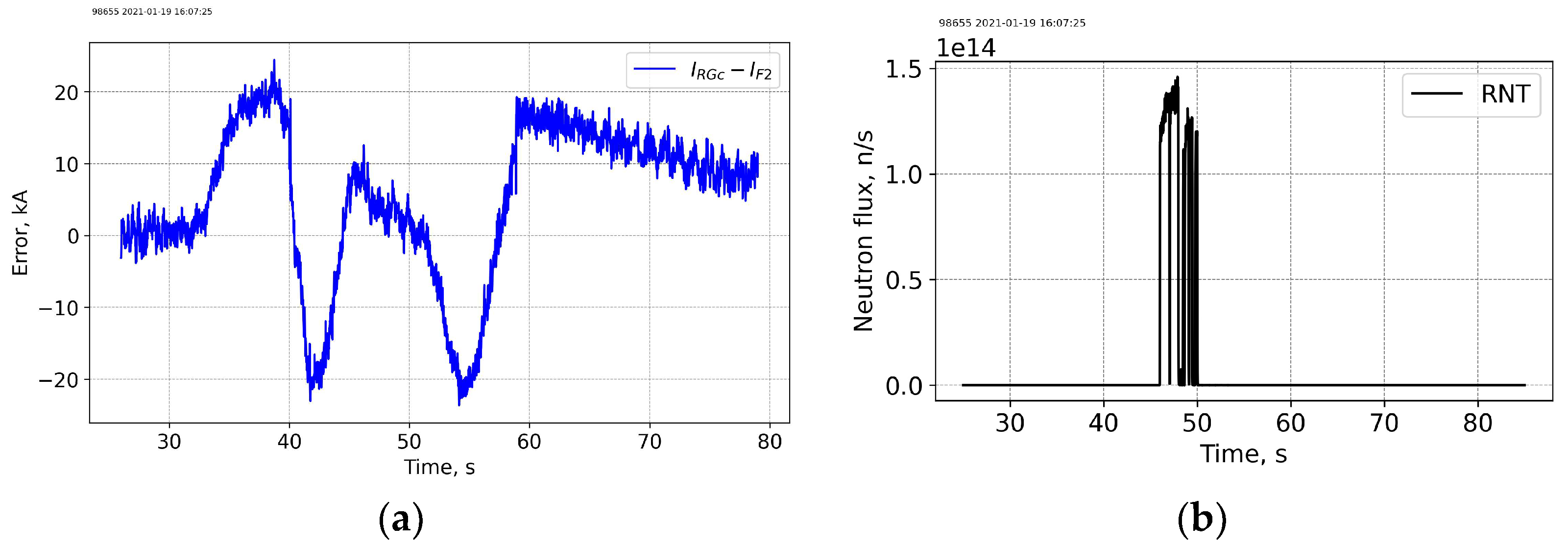 Shot 98655. Current measurement error (a) and the neutron fluence (b). RNT—total neutron flux.
