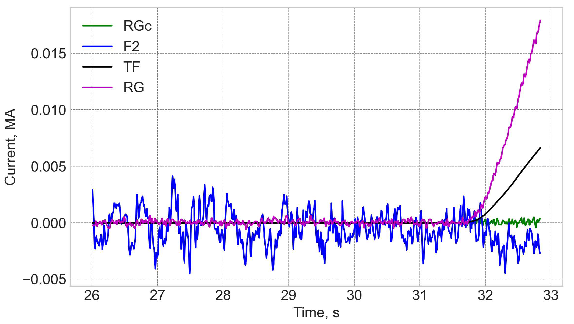 Shot 98655. Comparison of Rogowski (RG), corrected Rogowski (RGc), and FOCS (F2) measurements in the zero current operation. TF—toroidal field coil current.
