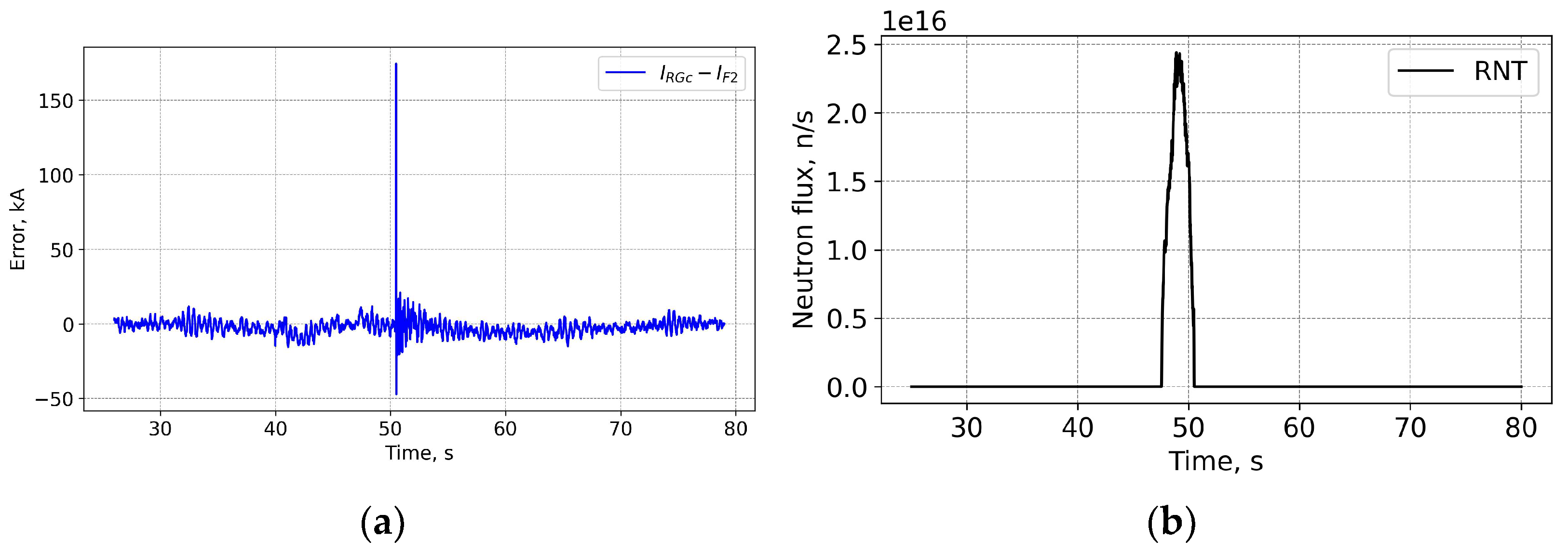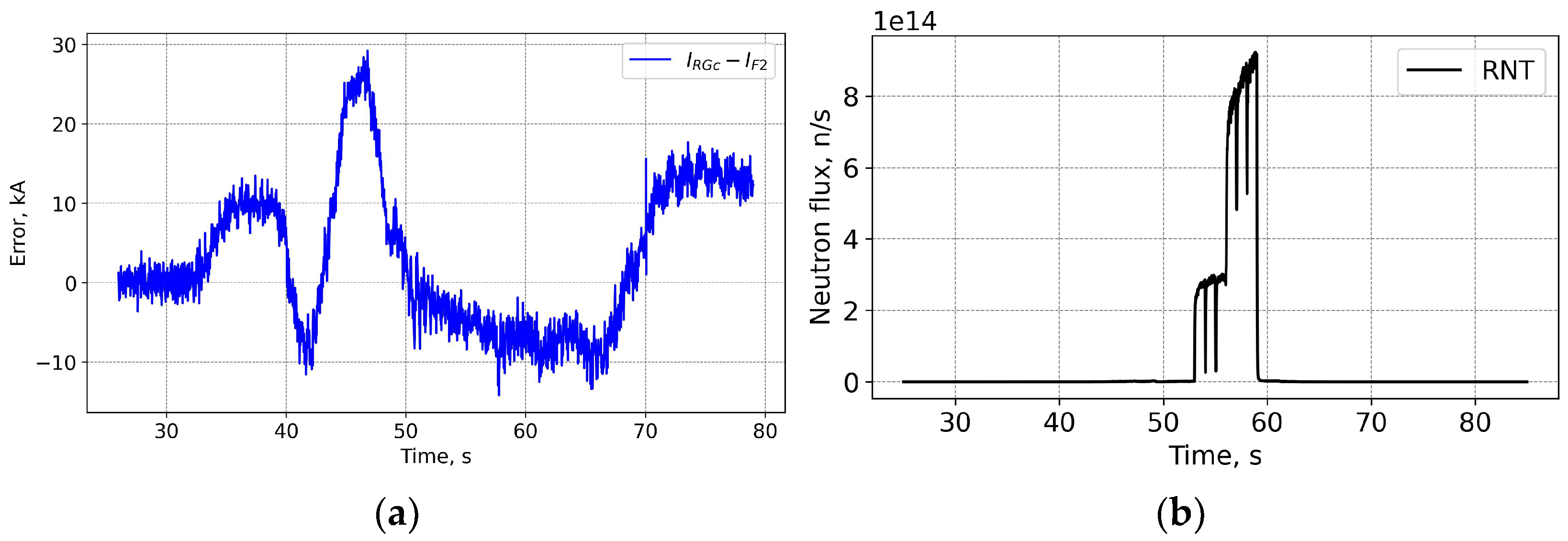 Shot 99282. Current measurement error (a) and the neutron fluence (b). RNT—total neutron flux.