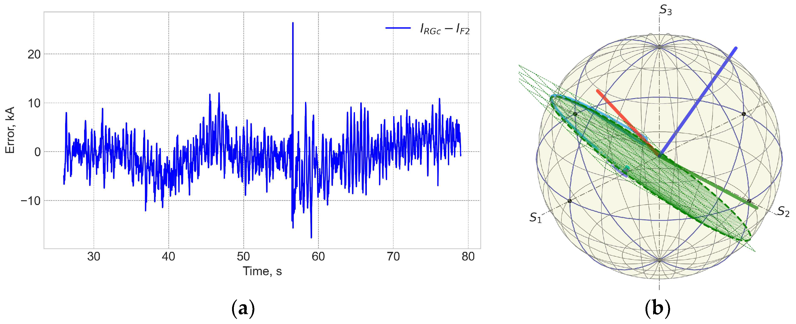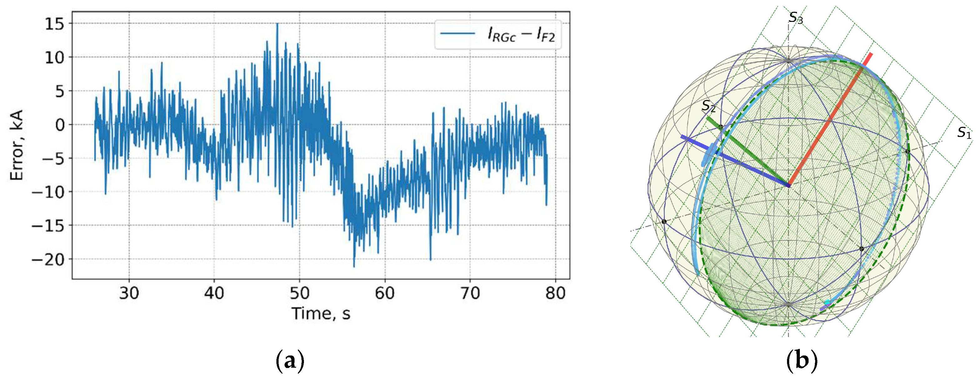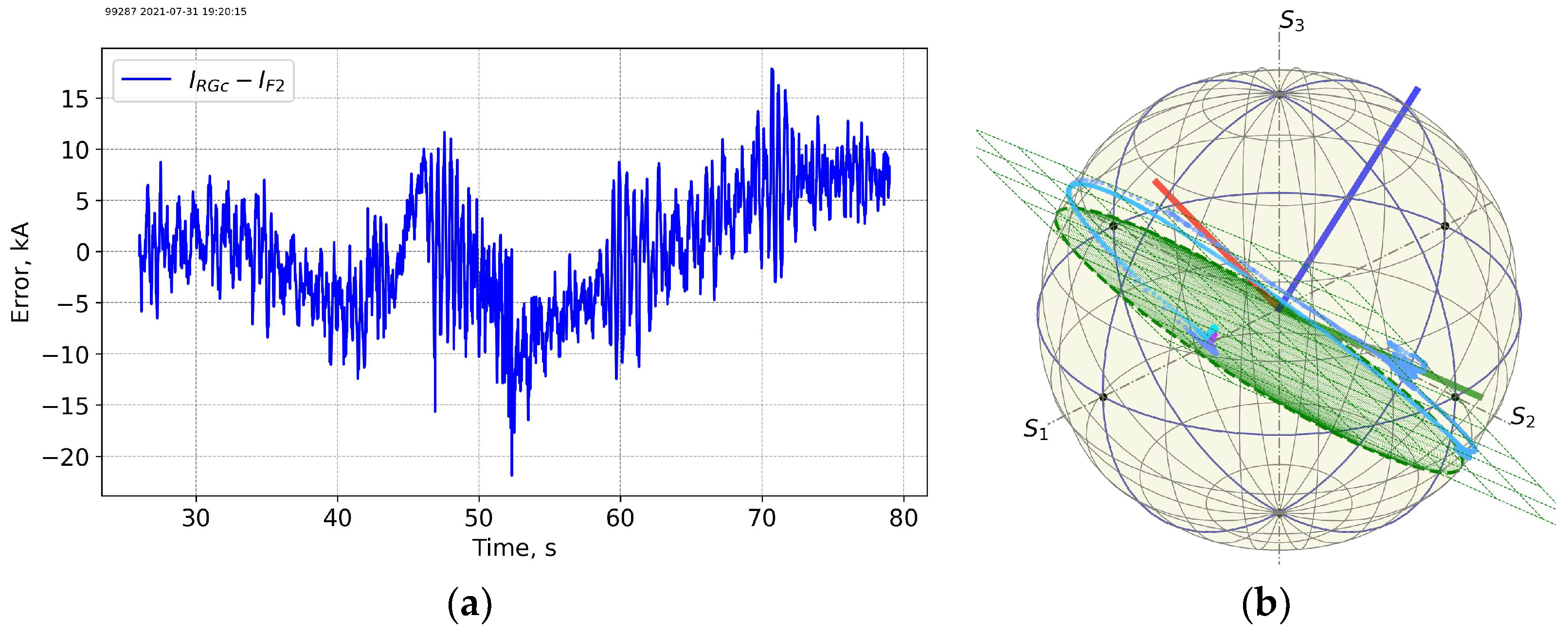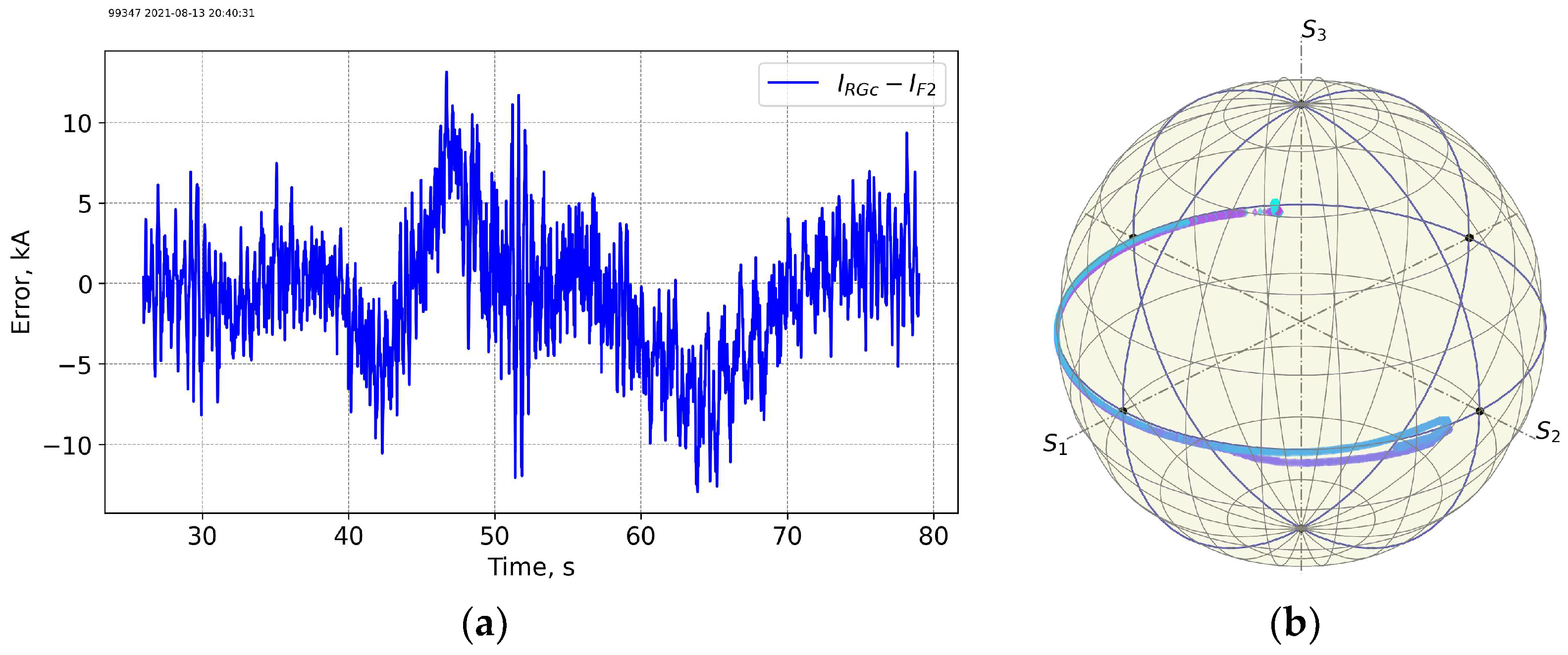 It is useful to note that the intrinsic noise level of the FOCS is an order of magnitude higher than that of Rogowski, Figure 6. This difference is a consequence of an insufficient mechanical protection of the long connecting optical cable based on the standard SMF-28 type fibres, which pick up mechanical perturbations. The use of a better protection or a reflective configuration with a Faraday mirror allows reduction of this noise to the level defined by the optical hardware, which is comparable to that of Rogowski. Slow variations in the error are related to the FOCS trace deviations from the reference plane. For this shot the FOCS trace on the Poincaré sphere (PS) can be fit to a plane with S3 = 0.415 ± 0.041. The standard deviation of 0.04 corresponds to the measurement errors up to 25 kA.