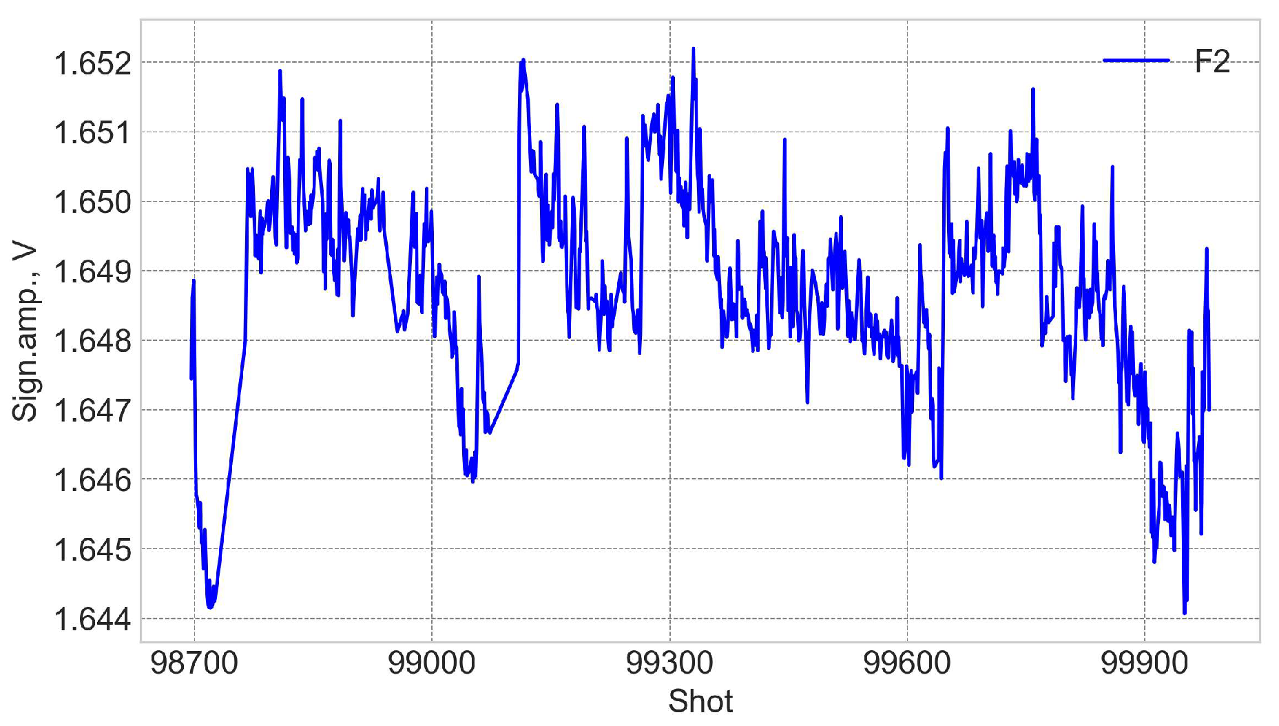 FOCS operation is based on the polarisation rotation detection. Although the Stokes vector is normalised and the polarisation rotation detection does not depend on the degree of polarisation (DOP), it is useful to check how DOP can be modified. In Figure 21 the DOP is represented for the Shot 99971 in arbitrary (V) units. According to the IPM5300 specification, the DOP signal is from −2.5 to + 2.5 V. +1.5 V signal corresponds to 100% polarised light, 0 V to 62.5%. In the present case the maximal signal is +1.56 V, which formally corresponds to a DOP of 101.5%. In practice, the value of +1.56 V should correspond to nearly 100% polarised light, but because formally it corresponds to more than 100% DOP we are not able to provide the exact DOP conversion. The conclusion here is that there is a small but detectable decrease in the polarisation degree, which can be correlated with start and the end of plasma operation.