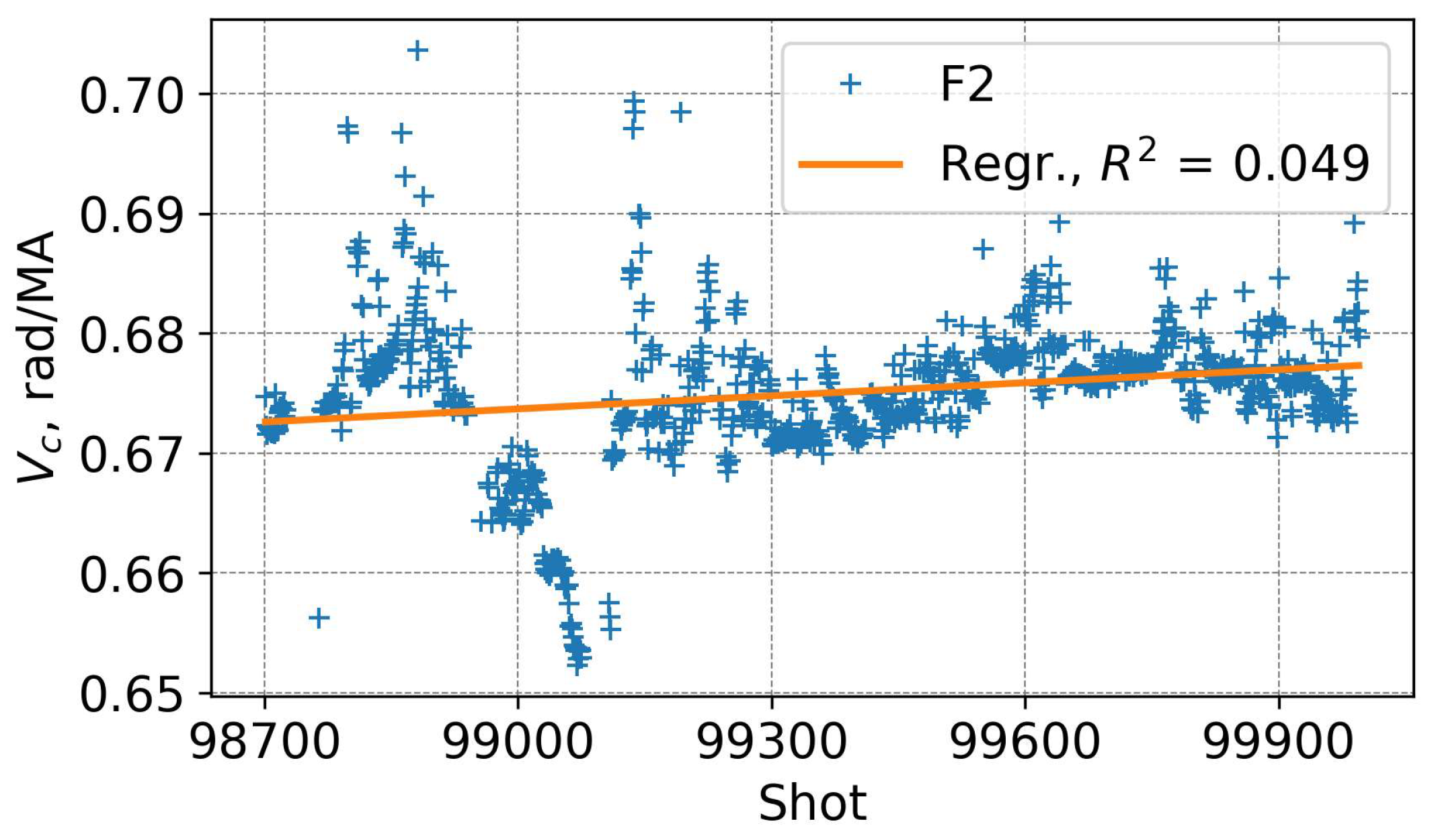 The systematic measurement error can grow as a result of neutron radiation induced change in the Verdet constant. A significant impact of gamma radiation on the Verdet constant of the standard SMF-28 fibre has been observed [,]. To analyse such a possible effect, we consider the Verdet constant as a parameter, which can be adjusted to obtain a best match between the FOCS and the continuous Rogowski. Before a shot, variations in the reference external Rogowski system are within ±0.5 kA, while variations in FOCS 2 are in a range of ±5 kA. FOCS fluctuations are related to the accuracy of the Stokes parameter measurements and perturbations of the sensing and the link fibres and are not related to possible Verdet’s constant changes. To find the Verdet constant we used data for currents not smaller than 50% of the maximal current during the shot and averaged zero current data.