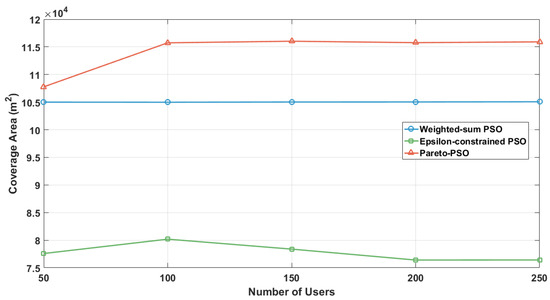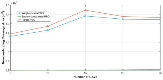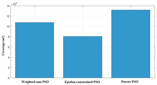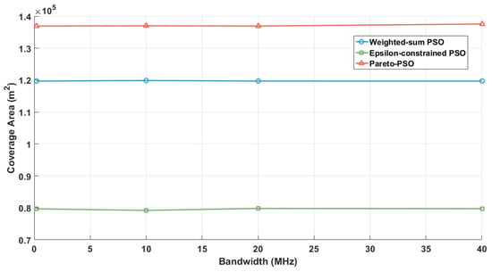 Figure 13 examines the impact of system bandwidth on the achievable non-overlapping coverage for the three optimization strategies. Across the examined range (200 kHz–40 MHz), all curves are nearly flat. This indicates that coverage in the studied system is determined by UAV geometry and line-of-sight conditions rather than spectral width. Among the strategies, Pareto-PSO achieved the highest coverage (≈), Weighted-sum PSO performed slightly lower (≈), and Epsilon-constrained PSO remained significantly smaller (≈). The flat trend across all curves confirms that bandwidth allocation affects throughput but does not expand the physical coverage footprint. Thus, improving coverage should rely on UAV deployment policies such as placement, altitude optimization, and interference management, while bandwidth should be tuned primarily for data rate objectives.