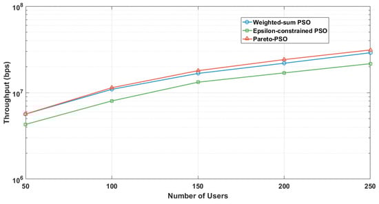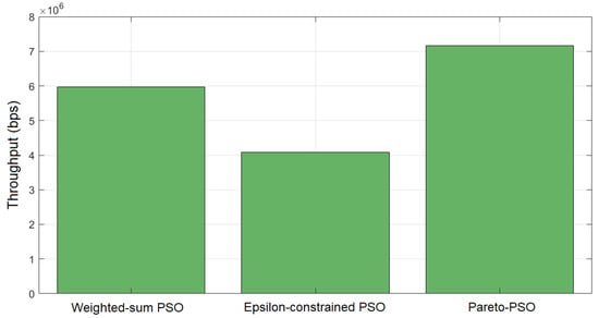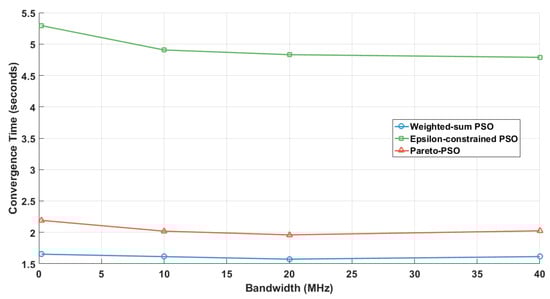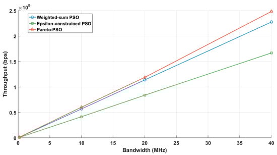 Figure 14 depicts a near-linear scaling of the aggregate throughput with bandwidth from 10 to 40 MHz, which is a behavior consistent with a capacity increasing proportionally to the system bandwidth under approximately stable SINR conditions. Pareto-PSO consistently formed the upper envelope, demonstrating superior SINR exploitation and spectrum efficiency. Weighted-sum PSO tracked closely but remained below due to scalarization trade-offs, while Epsilon-constrained PSO lagged, as its feasibility limits restrict aggressive rate maximization. Overall, Pareto-PSO delivered the highest throughput across all bandwidths and achieved steeper scaling, making it the most effective strategy when spectrum expansion is key.