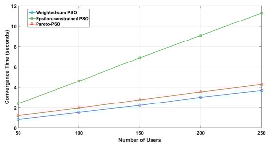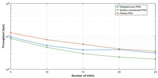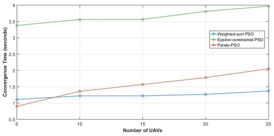 Figure 15 examines solver runtime as a function of bandwidth across 200 kHz–40 MHz, while the number of edge-UAVs was fixed at five, and number of GUs was fixed at 200. Weighted-sum PSO was the fastest and nearly bandwidth-insensitive, fluctuating around 1.6 s, which is consistent with scalar optimization’s minimal overhead. Pareto-PSO showed a shallow U-shape: its runtime decreased from about 2.2 s at 0 MHz to 2.0 s near 20 MHz and then stabilized slightly above 2.0 s, reflecting smoother rate feedback balanced by archive management costs. Epsilon-constrained PSO recorded the highest runtimes but declined from 5.3 s to 4.8 s, indicating that higher bandwidth relaxes feasibility pressure and reduces search effort.