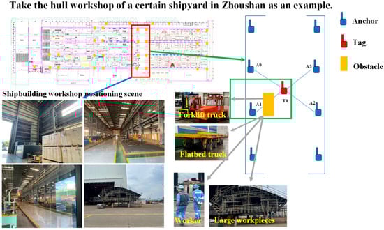 Ultra-Wideband (UWB) technology is a versatile radio frequency (RF) technology [1,2] that uses nanosecond-level non-sinusoidal narrow pulses for data transmission. It features high multipath resolution, strong penetration capability, and high positioning accuracy [3,4], and is widely applied in positioning, ranging, and target detection in indoor and complex environments [5]. The key challenge in UWB positioning technology lies in accurately estimating the actual distance between a tag and an anchor node using information such as received signal strength, time-of-flight, and signal arrival angle from UWB anchor nodes [6]. Generally, UWB ranging accuracy is affected by internal and external factors. Internal factors include hardware interference within the system and errors in built-in algorithms; external factors primarily involve non-line-of-sight (NLOS) environmental interference [7]. Internal errors can be effectively corrected through algorithm improvements, but external errors are difficult to eliminate in practical scenarios [8,9]. For example, in a large shipyard manufacturing enterprise, metal components, moving personnel, and vehicles within the processing workshop can cause UWB anchors to be in NLOS states, significantly interfering with ranging accuracy. Due to location uncertainty, safety accidents frequently occur. Therefore, research on indoor high-precision ranging and positioning holds great practical significance. The workshop application scenario is illustrated in Figure 1. In the four-anchor-one-tag positioning system (A0, A1, A2, A3, T0), distance measurements in the A1-T0 section exhibit a positive bias. The extent of this bias depends on the material, size, and reflective properties of NLOS obstructions. Additionally, due to unpredictable personnel, workpiece, and vehicle movements, real-time positioning systems relying solely on algorithms struggle to maintain high stability and risk positioning failure.
