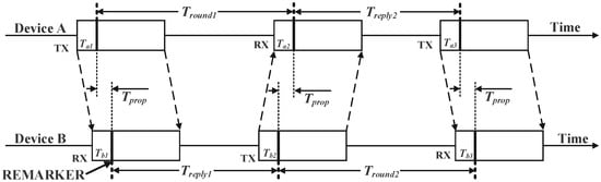 Among these, Tround1 is the time interval from Device A transmitting a signal to Device B until receiving Device B’s response, and Tround2 is the time interval from Device B receiving Device A’s initial signal until receiving Device A’s subsequent signal. Treply1 is the time interval between Device B receiving a signal and transmitting its response, and Treply2 is the time interval between Device A receiving Device B’s response and transmitting its next signal.