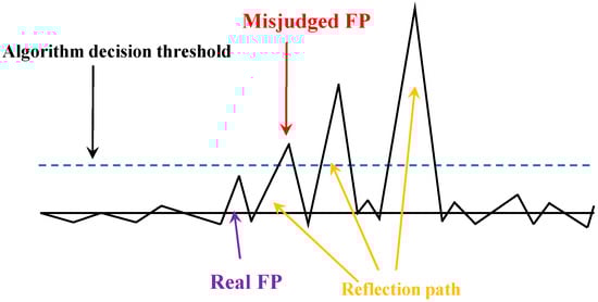 In LOS scenarios, the strongest path of the UWB signal is closely aligned with the first path in the accumulator window. While in NLOS scenarios, the strongest path typically appears on the right side of the accumulator window, exhibiting significant positional deviation from the first path, as shown in Figure 3. Since UWB ranging employs a leading-edge detection algorithm, the target position is determined by the first path’s accumulator position that exceeds the system-set threshold. Consequently, when the communication environment transitions between LOS and NLOS states, the attenuated first path may fall below the detection threshold. This causes the system to misidentify the strongest path as the first path, generating substantial distance residuals. These residuals represent the difference between the current distance measurement or optimal distance estimate and the corresponding value from the previous moment: