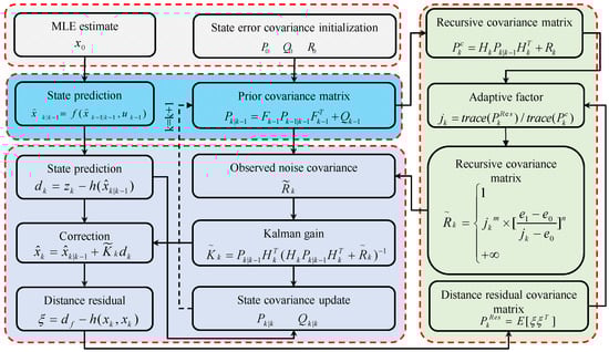 The adjusted observation noise feeds back into the Kalman gain for NLOS distance compensation, as shown in Figure 4. MLE-processed distance values initialize the AEKF. By analyzing the ratio between the distance residual covariance and recursive covariance matrices for current measurements and prior predictions, the adaptive factor is derived. Based on magnitude, the observation noise is dynamically scaled to update the Kalman gain, correcting distance measurements.