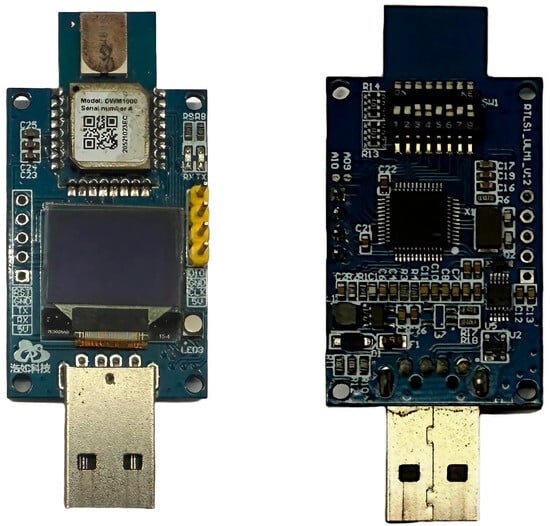 This section selects appropriate scenarios to conduct UWB experiments validating NLOS/LOS transitions and error compensation methods. Experimental equipment utilizes DecaWave’s DW1000 module with an STM32F103 main controller. In LOS conditions, specifications include ranging accuracy of ±5 cm, positioning frequency of 15 ms, transmission power of −39 dBm/MHz, transmission gain of 20 dB, bandwidth of 500 MHz, and communication rate of 110 K/6.8 MHz. The experimental apparatus is shown in Figure 5.