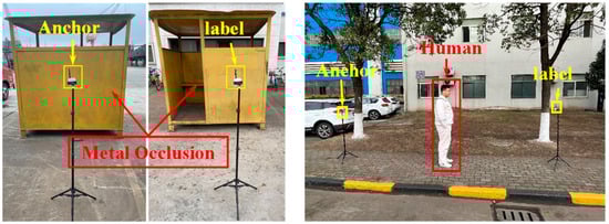 To validate the NLOS identification method’s effectiveness and robustness, experiments were conducted at 2.6–3 m ranges using two obstruction categories: human and metal. Each NLOS obstruction event was brief and repeated multiple times, representing common workshop interference scenarios. Parameter settings, calibrated using the sample variance of the static segment of LOS, configured the ranging system as a single-mode system with state transition matrix = 1, process noise covariance is 0.015 m2, and measurement noise covariance is 0.542 m2. Figure 6 presents some physical photographs that illustrate the experimental process.