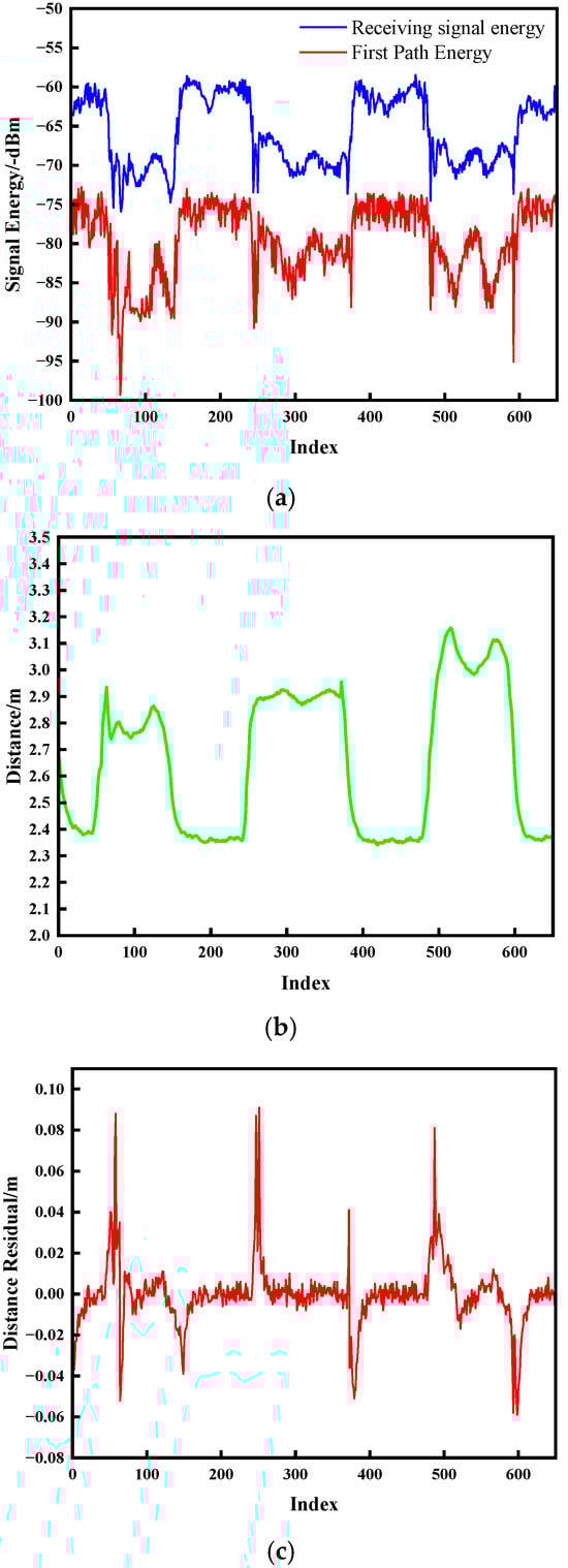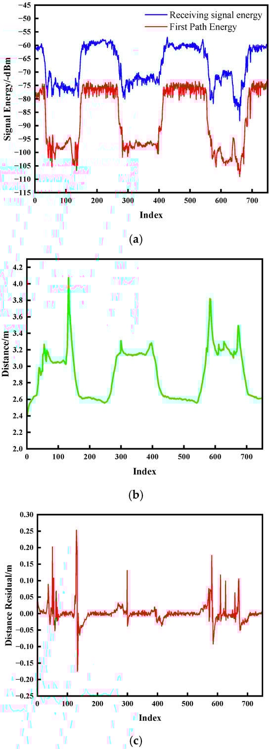 Figure 7 and Figure 8 present the experimental outcomes for dynamic NLOS detection. Subfigure ensembles (a) illustrate temporal energy variations, (b) depict ranging distance trajectories, and (c) document distance residual fluctuations.