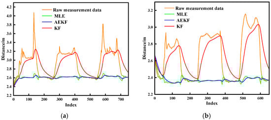 Leveraging NLOS detection, Figure 9 presents compensated ranging performance using the proposed MLE-AEKF framework. Figure 9a,b quantify compensation efficacy for anthropomorphic and metallic obstructions, respectively. The ranging values obtained after MLE fitting significantly mitigate interference-induced ranging errors, driving the distance curve to asymptotically approach static LOS baseline measurements. However, the compensated data still exhibits sub-centimeter residual peak deviations. The AEKF-processed output effectively suppresses these artifacts through dynamic Kalman gain modulation via adaptive scaling factors, substantially reducing peak-induced interference. The KF algorithm (red lines in the figures), widely employed for error mitigation, fails to correct ranging errors under sustained NLOS interference conditions. In contrast, the proposed algorithm delivers superior compensation performance in obstructed environments. Compensated distance values achieve near-LOS accuracy, with specific error reduction rates of 93.75% for anthropomorphic obstructions and 93.11% for metallic obstructions compared to traditional KF implementations.